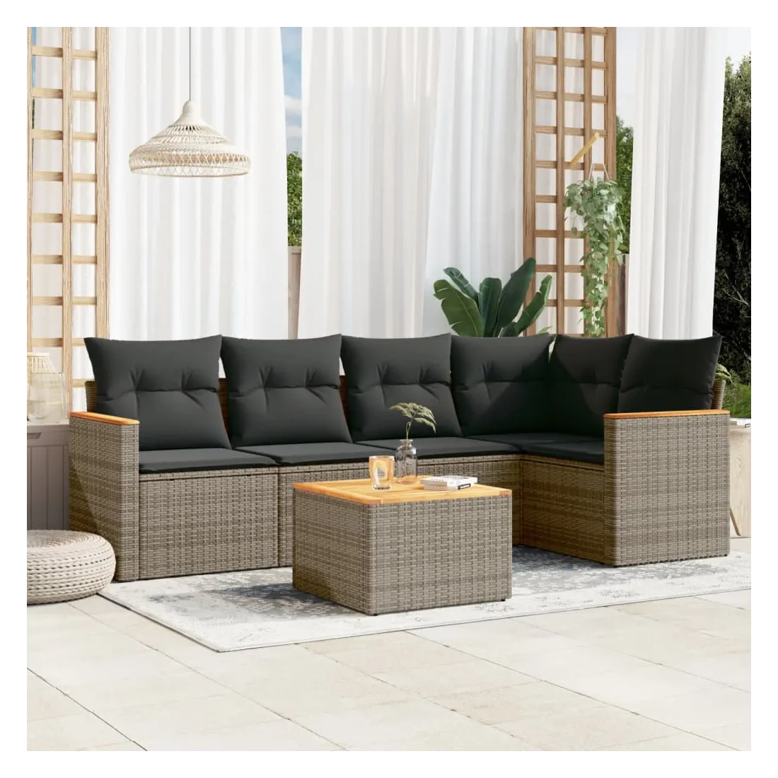 Cet ensemble de canapés de jardin est le complément parfait de votre arrière-cour, terrasse ou patio, offrant un espace confortable et accueillant pour discuter avec la famille et les amis ou simplement se détendre et profiter de l'extérieur. Matériau durable : la résine tressée, également connue sous le nom de poly rotin, est un matériau synthétique solide et nécessitant peu d'entretien qui ressemble au rotin naturel. Il est léger, facile à nettoyer et couramment utilisé pour les meubles d'extérieur en raison de sa durabilité et de ses propriétés de résistance aux intempéries.Dessus stable et facile à nettoyer : cette table de jardin a un dessus en bois d'acacia robuste, durable et facile à nettoyer avec un chiffon humide.Housse amovible et lavable : ces coussins de siège sont dotés de housses amovibles pour un lavage et un entretien faciles.Cadre robuste et stable : le cadre en acier enduit de poudre assure la solidité et la stabilité du meuble de jardin pour une utilisation quotidienne à l'extérieur.Conception modulaire : cet ensemble de meubles d'extérieur a une conception modulaire, ce qui le rend complètement flexible et facile à déplacer, afin que vous puissiez créer un agencement de meubles d'extérieur personnalisé. Bon à savoir :Pour que vos meubles d'extérieur restent beaux, nous vous recommandons de les protéger avec une housse imperméable.