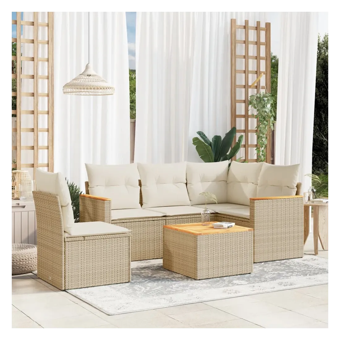 Cet ensemble de canapés de jardin est le complément parfait de votre arrière-cour, terrasse ou patio, offrant un espace confortable et accueillant pour discuter avec la famille et les amis ou simplement se détendre et profiter de l'extérieur. Matériau durable : la résine tressée, également connue sous le nom de poly rotin, est un matériau synthétique solide et nécessitant peu d'entretien qui ressemble au rotin naturel. Il est léger, facile à nettoyer et couramment utilisé pour les meubles d'extérieur en raison de sa durabilité et de ses propriétés de résistance aux intempéries.Dessus stable et facile à nettoyer : cette table de jardin a un dessus en bois d'acacia robuste, durable et facile à nettoyer avec un chiffon humide.Housse amovible et lavable : ces coussins de siège sont dotés de housses amovibles pour un lavage et un entretien faciles.Cadre robuste et stable : le cadre en acier enduit de poudre assure la solidité et la stabilité du meuble de jardin pour une utilisation quotidienne à l'extérieur.Conception modulaire : cet ensemble de meubles d'extérieur a une conception modulaire, ce qui le rend complètement flexible et facile à déplacer, afin que vous puissiez créer un agencement de meubles d'extérieur personnalisé. Bon à savoir :Pour que vos meubles d'extérieur restent beaux, nous vous recommandons de les protéger avec une housse imperméable.