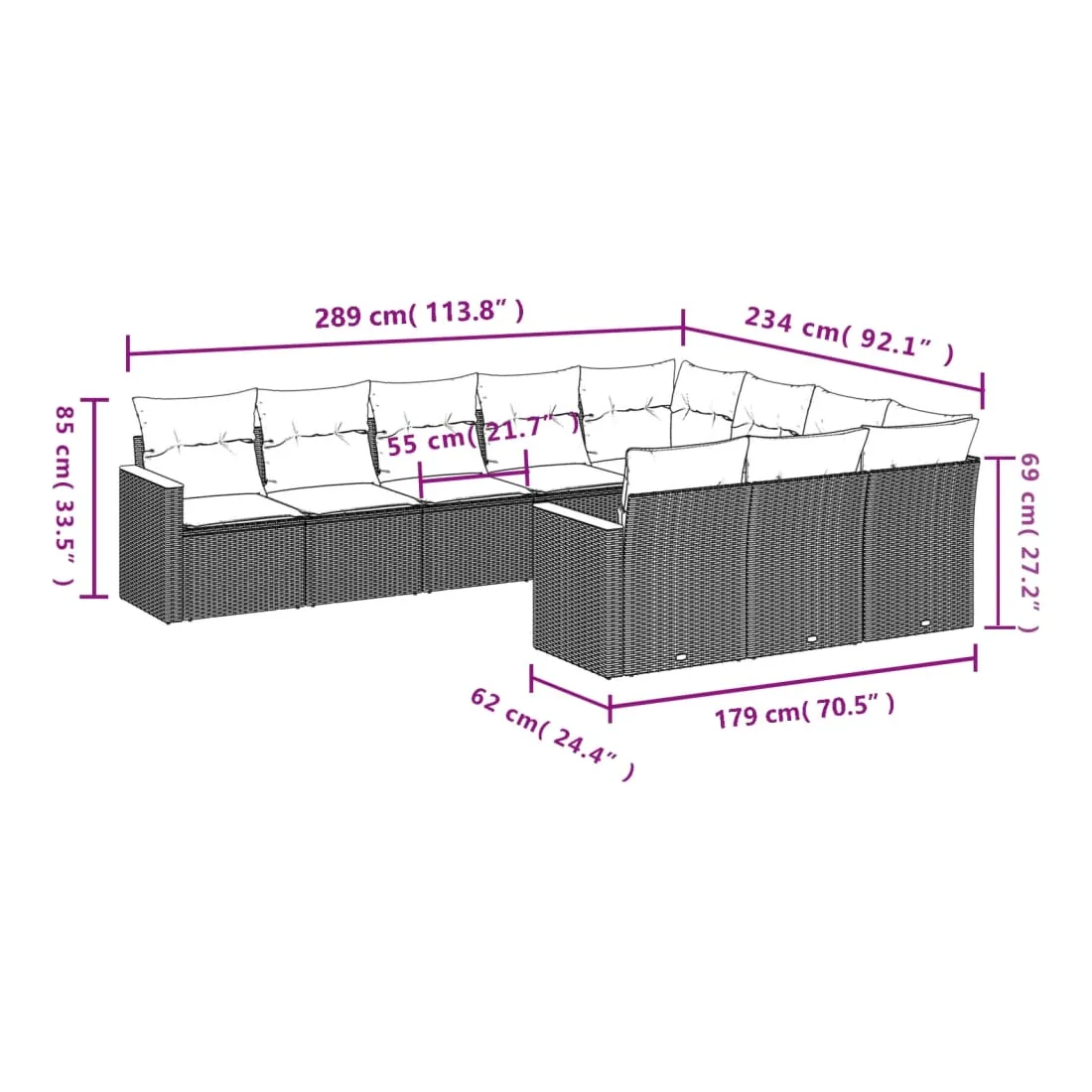 Cet ensemble de canapés de jardin est le complément parfait de votre arrière-cour, terrasse ou patio, offrant un espace confortable et accueillant pour discuter avec la famille et les amis ou simplement se détendre et profiter de l'extérieur. Matériau durable : la résine tressée, également connue sous le nom de poly rotin, est un matériau synthétique solide et nécessitant peu d'entretien qui ressemble au rotin naturel. Il est léger, facile à nettoyer et couramment utilisé pour les meubles d'extérieur en raison de sa durabilité et de ses propriétés de résistance aux intempéries.Housse amovible et lavable : ces coussins de siège sont dotés de housses amovibles pour un lavage et un entretien faciles.Cadre robuste et stable : le cadre en acier enduit de poudre assure la solidité et la stabilité du meuble de jardin pour une utilisation quotidienne à l'extérieur.Conception modulaire : cet ensemble de meubles d'extérieur a une conception modulaire, ce qui le rend complètement flexible et facile à déplacer, afin que vous puissiez créer un agencement de meubles d'extérieur personnalisé. Bon à savoir :Pour que vos meubles d'extérieur restent beaux, nous vous recommandons de les protéger avec une housse imperméable.