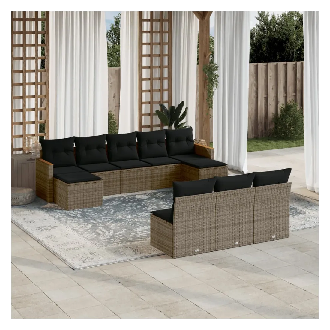 Cet ensemble de canapés de jardin est le complément parfait de votre arrière-cour, terrasse ou patio, offrant un espace confortable et accueillant pour discuter avec la famille et les amis ou simplement se détendre et profiter de l'extérieur. Matériau durable : la résine tressée, également connue sous le nom de poly rotin, est un matériau synthétique solide et nécessitant peu d'entretien qui ressemble au rotin naturel. Il est léger, facile à nettoyer et couramment utilisé pour les meubles d'extérieur en raison de sa durabilité et de ses propriétés de résistance aux intempéries.Housse amovible et lavable : ces coussins de siège sont dotés de housses amovibles pour un lavage et un entretien faciles.Cadre robuste et stable : le cadre en acier enduit de poudre assure la solidité et la stabilité du meuble de jardin pour une utilisation quotidienne à l'extérieur.Conception modulaire : cet ensemble de meubles d'extérieur a une conception modulaire, ce qui le rend complètement flexible et facile à déplacer, afin que vous puissiez créer un agencement de meubles d'extérieur personnalisé. Bon à savoir :Pour que vos meubles d'extérieur restent beaux, nous vous recommandons de les protéger avec une housse imperméable.