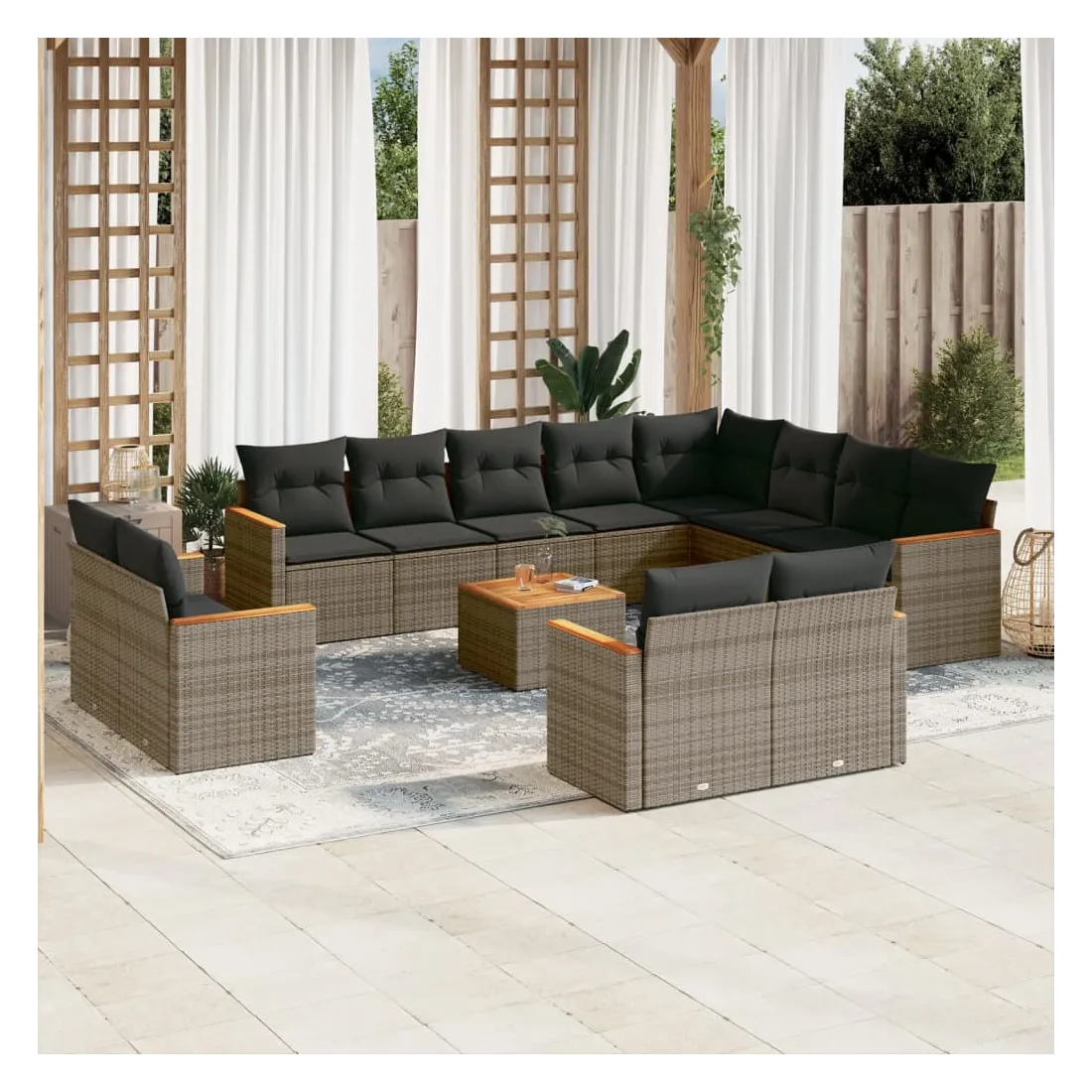 Cet ensemble de canapés de jardin est le complément parfait de votre arrière-cour, terrasse ou patio, offrant un espace confortable et accueillant pour discuter avec la famille et les amis ou simplement se détendre et profiter de l'extérieur. Matériau durable : la résine tressée, également connue sous le nom de poly rotin, est un matériau synthétique solide et nécessitant peu d'entretien qui ressemble au rotin naturel. Il est léger, facile à nettoyer et couramment utilisé pour les meubles d'extérieur en raison de sa durabilité et de ses propriétés de résistance aux intempéries.Dessus stable et facile à nettoyer : cette table de jardin a un dessus en bois d'acacia robuste, durable et facile à nettoyer avec un chiffon humide.Housse amovible et lavable : ces coussins de siège sont dotés de housses amovibles pour un lavage et un entretien faciles.Cadre robuste et stable : le cadre en acier enduit de poudre assure la solidité et la stabilité du meuble de jardin pour une utilisation quotidienne à l'extérieur.Conception modulaire : cet ensemble de meubles d'extérieur a une conception modulaire, ce qui le rend complètement flexible et facile à déplacer, afin que vous puissiez créer un agencement de meubles d'extérieur personnalisé. Bon à savoir :Pour que vos meubles d'extérieur restent beaux, nous vous recommandons de les protéger avec une housse imperméable.