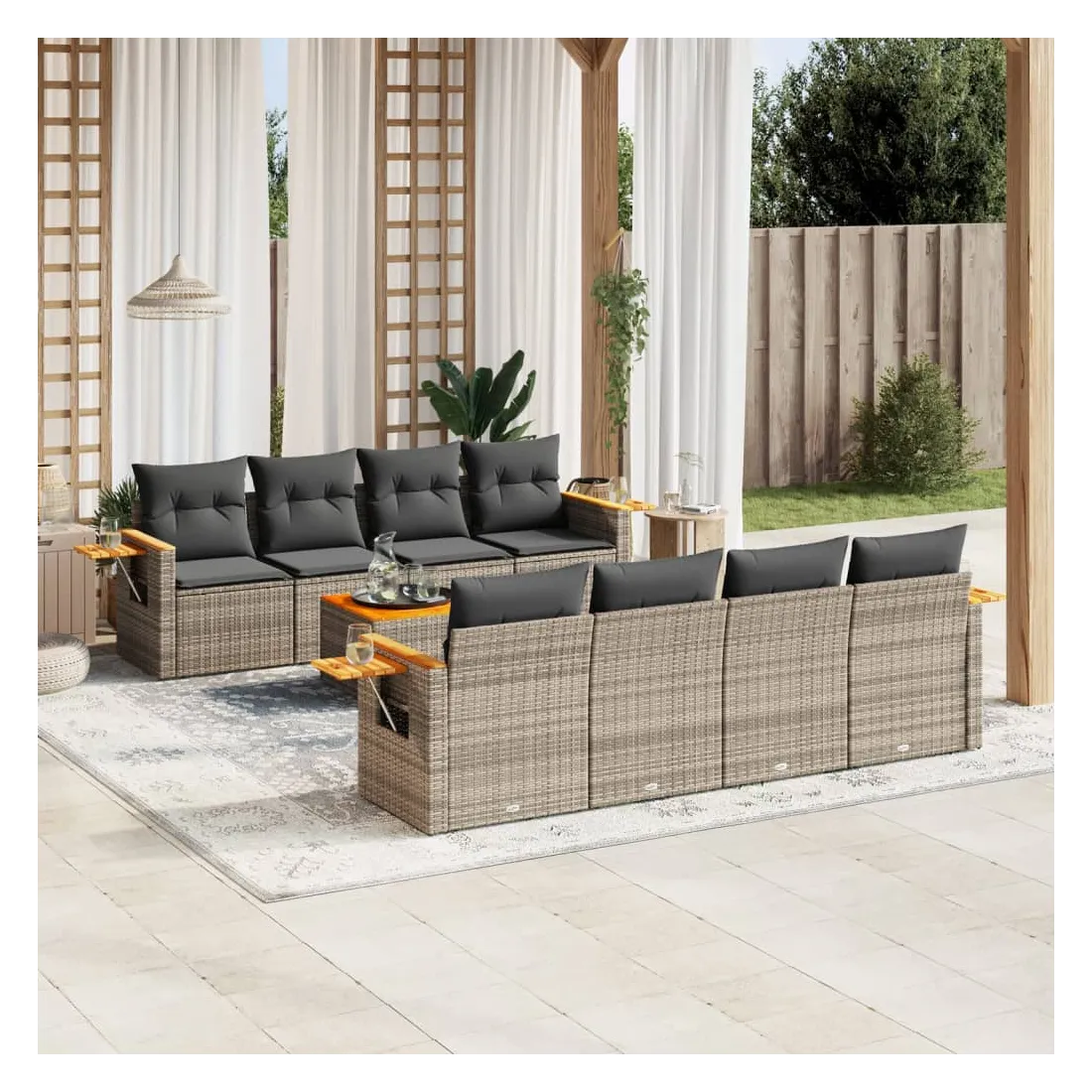 Cet ensemble de canapés de jardin est le complément parfait de votre arrière-cour, terrasse ou patio, offrant un espace confortable et accueillant pour discuter avec la famille et les amis ou simplement se détendre et profiter de l'extérieur. Matériau durable : la résine tressée, également connue sous le nom de poly rotin, est un matériau synthétique solide et nécessitant peu d'entretien qui ressemble au rotin naturel. Il est léger, facile à nettoyer et couramment utilisé pour les meubles d'extérieur en raison de sa durabilité et de ses propriétés de résistance aux intempéries.Dessus stable et facile à nettoyer : cette table de jardin a un dessus en bois d'acacia robuste, durable et facile à nettoyer avec un chiffon humide.Table d'appoint pratique : ce mobilier d'extérieur comprend une table d'appoint pliable avec un ressort à gaz sur les accoudoirs, offrant un endroit pratique pour garder vos essentiels à portée de main.Housse amovible et lavable : ces coussins de siège sont dotés de housses amovibles pour un lavage et un entretien faciles.Conception modulaire : cet ensemble de meubles d'extérieur a une conception modulaire, ce qui le rend complètement flexible et facile à déplacer, afin que vous puissiez créer un agencement de meubles d'extérieur personnalisé. Bon à savoir :Pour que vos meubles d'extérieur restent beaux, nous vous recommandons de les protéger avec une housse imperméable.