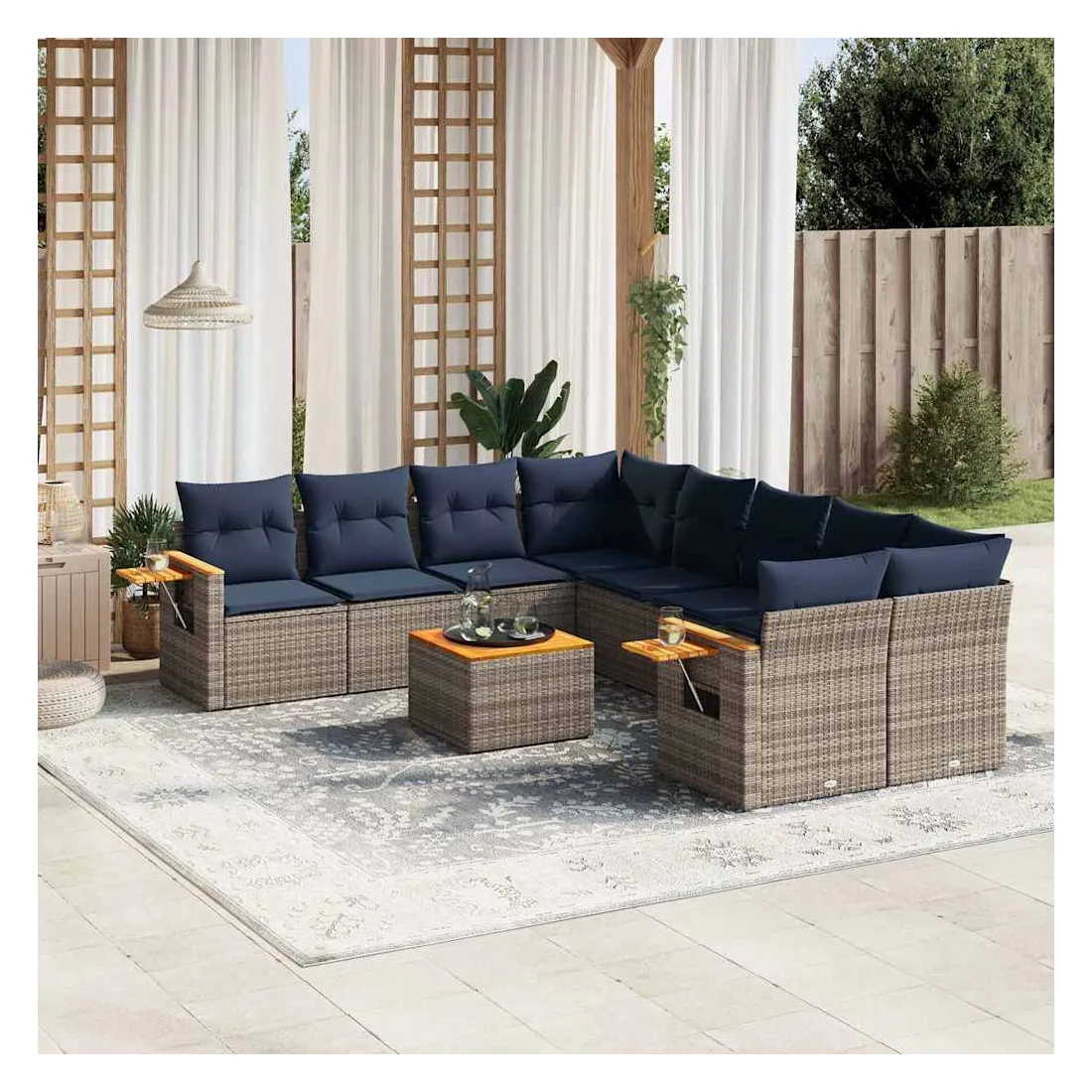 Cet ensemble de canapés de jardin est le complément parfait de votre arrière-cour, terrasse ou patio, offrant un espace confortable et accueillant pour discuter avec la famille et les amis ou simplement se détendre et profiter de l'extérieur. Matériau durable : la résine tressée, également connue sous le nom de poly rotin, est un matériau synthétique solide et nécessitant peu d'entretien qui ressemble au rotin naturel. Il est léger, facile à nettoyer et couramment utilisé pour les meubles d'extérieur en raison de sa durabilité et de ses propriétés de résistance aux intempéries.Dessus stable et facile à nettoyer : cette table de jardin a un dessus en bois d'acacia robuste, durable et facile à nettoyer avec un chiffon humide.Table d'appoint pratique : ce mobilier d'extérieur comprend une table d'appoint pliable avec un ressort à gaz sur les accoudoirs, offrant un endroit pratique pour garder vos essentiels à portée de main.Housse amovible et lavable : ces coussins de siège sont dotés de housses amovibles pour un lavage et un entretien faciles.Conception modulaire : cet ensemble de meubles d'extérieur a une conception modulaire, ce qui le rend complètement flexible et facile à déplacer, afin que vous puissiez créer un agencement de meubles d'extérieur personnalisé. Bon à savoir :Pour que vos meubles d'extérieur restent beaux, nous vous recommandons de les protéger avec une housse imperméable.