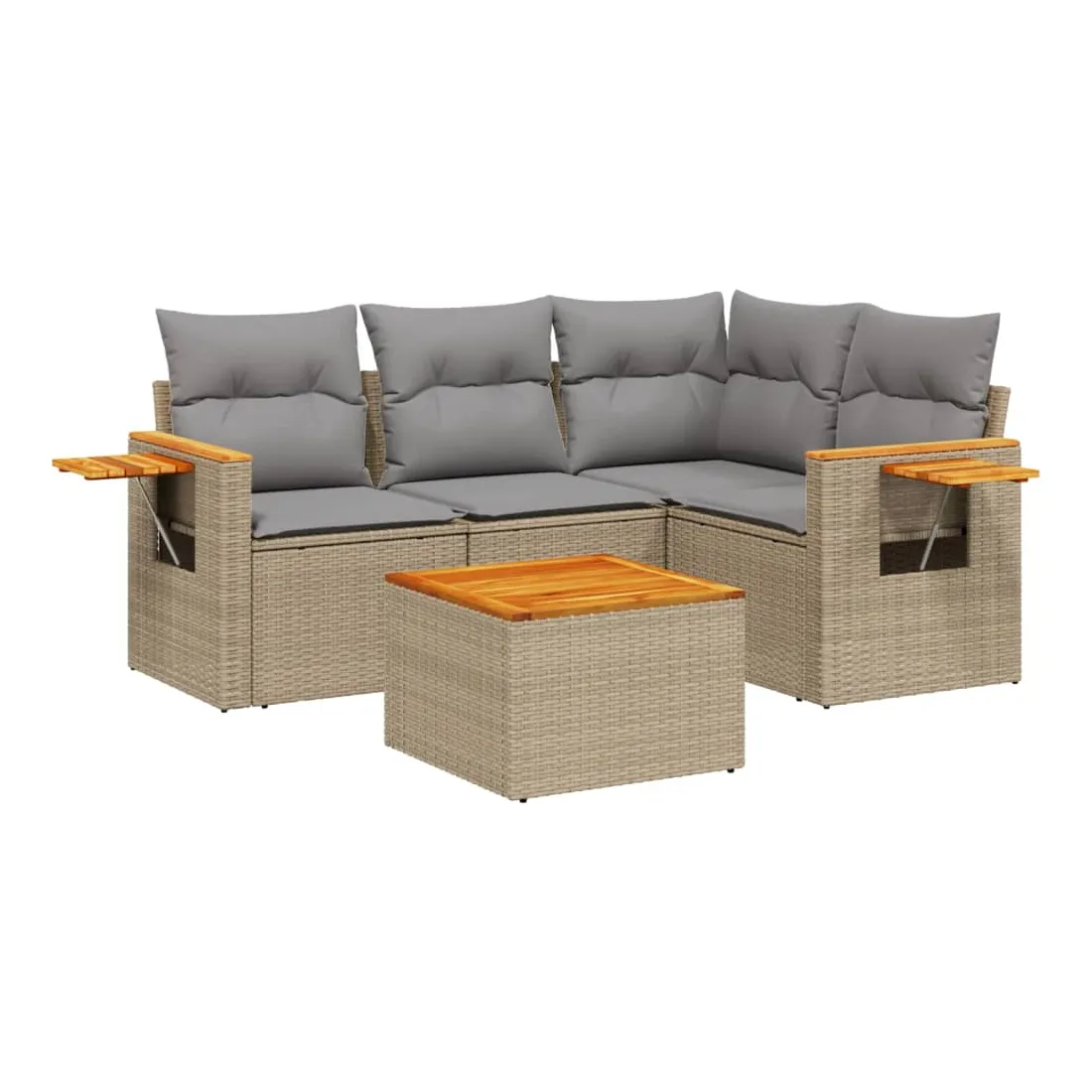 Cet ensemble de canapés de jardin est le complément parfait de votre arrière-cour, terrasse ou patio, offrant un espace confortable et accueillant pour discuter avec la famille et les amis ou simplement se détendre et profiter de l'extérieur. Matériau durable : la résine tressée, également connue sous le nom de poly rotin, est un matériau synthétique solide et nécessitant peu d'entretien qui ressemble au rotin naturel. Il est léger, facile à nettoyer et couramment utilisé pour les meubles d'extérieur en raison de sa durabilité et de ses propriétés de résistance aux intempéries.Dessus stable et facile à nettoyer : cette table de jardin a un dessus en bois d'acacia robuste, durable et facile à nettoyer avec un chiffon humide.Table d'appoint pratique : ce mobilier d'extérieur comprend une table d'appoint pliable avec un ressort à gaz sur les accoudoirs, offrant un endroit pratique pour garder vos essentiels à portée de main.Housse amovible et lavable : ces coussins de siège sont dotés de housses amovibles pour un lavage et un entretien faciles.Conception modulaire : cet ensemble de meubles d'extérieur a une conception modulaire, ce qui le rend complètement flexible et facile à déplacer, afin que vous puissiez créer un agencement de meubles d'extérieur personnalisé. Bon à savoir :Pour que vos meubles d'extérieur restent beaux, nous vous recommandons de les protéger avec une housse imperméable.