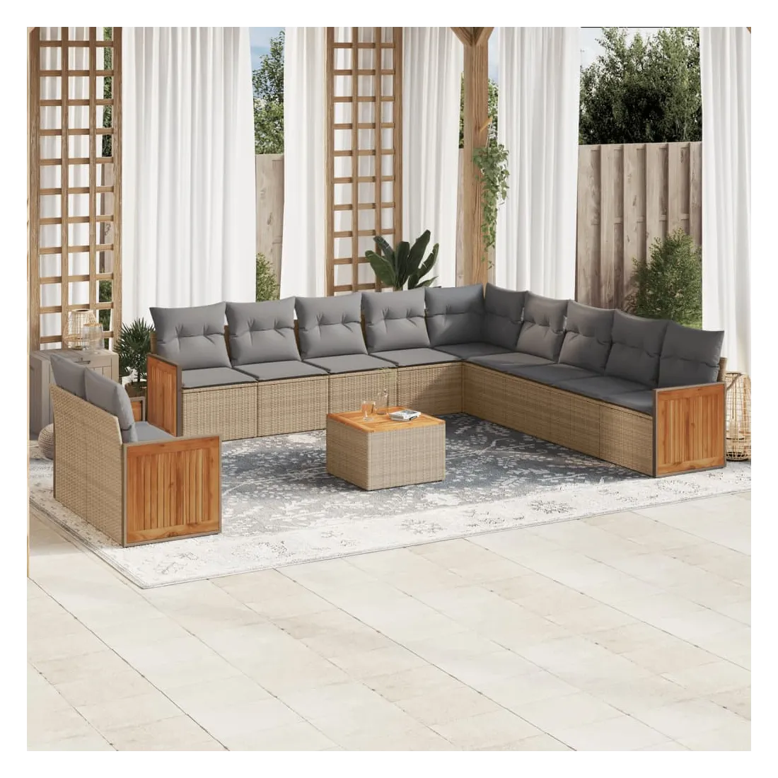 Cet ensemble de canapés de jardin est le complément parfait de votre arrière-cour, terrasse ou patio, offrant un espace confortable et accueillant pour discuter avec la famille et les amis ou simplement se détendre et profiter de l'extérieur. Matériau durable : la résine tressée, également connue sous le nom de poly rotin, est un matériau synthétique solide et nécessitant peu d'entretien qui ressemble au rotin naturel. Il est léger, facile à nettoyer et couramment utilisé pour les meubles d'extérieur en raison de sa durabilité et de ses propriétés de résistance aux intempéries.Expérience d'assise confortable : ce mobilier d'extérieur, doté de coussins épais, offre une expérience d'assise confortable.Dessus stable et facile à nettoyer : cette table de jardin a un dessus en bois d'acacia robuste, durable et facile à nettoyer avec un chiffon humide.Housse amovible et lavable : ces coussins de siège sont dotés de housses amovibles pour un lavage et un entretien faciles.Conception modulaire : cet ensemble de meubles d'extérieur a une conception modulaire, ce qui le rend complètement flexible et facile à déplacer, afin que vous puissiez créer un agencement de meubles d'extérieur personnalisé. Bon à savoir :Pour que vos meubles d'extérieur restent beaux, nous vous recommandons de les protéger avec une housse imperméable.