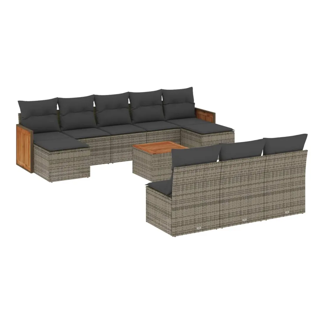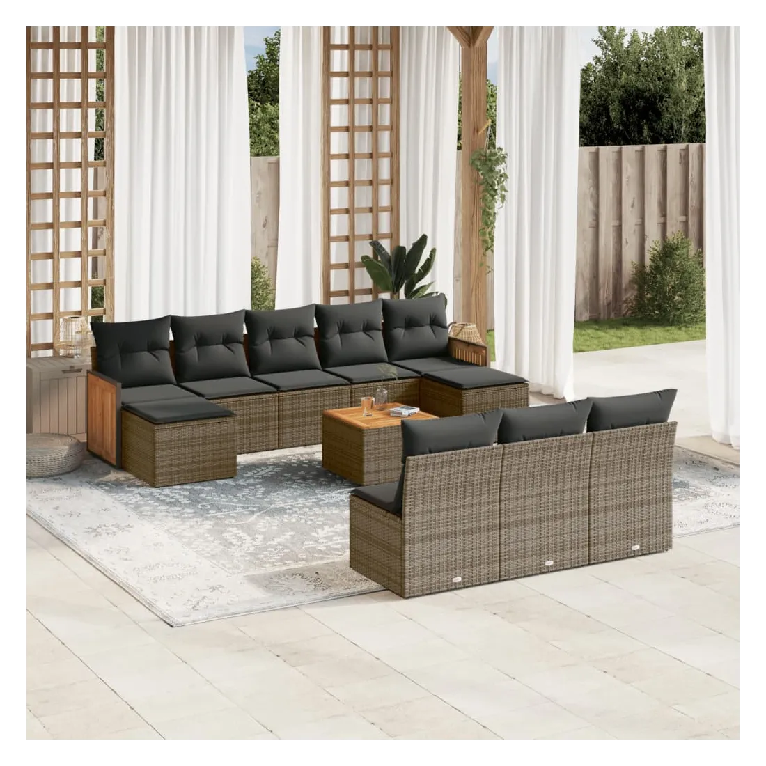 Cet ensemble de canapés de jardin est le complément parfait de votre arrière-cour, terrasse ou patio, offrant un espace confortable et accueillant pour discuter avec la famille et les amis ou simplement se détendre et profiter de l'extérieur. Matériau durable : la résine tressée, également connue sous le nom de poly rotin, est un matériau synthétique solide et nécessitant peu d'entretien qui ressemble au rotin naturel. Il est léger, facile à nettoyer et couramment utilisé pour les meubles d'extérieur en raison de sa durabilité et de ses propriétés de résistance aux intempéries.Expérience d'assise confortable : ce mobilier d'extérieur, doté de coussins épais, offre une expérience d'assise confortable.Dessus stable et facile à nettoyer : cette table de jardin a un dessus en bois d'acacia robuste, durable et facile à nettoyer avec un chiffon humide.Housse amovible et lavable : ces coussins de siège sont dotés de housses amovibles pour un lavage et un entretien faciles.Conception modulaire : cet ensemble de meubles d'extérieur a une conception modulaire, ce qui le rend complètement flexible et facile à déplacer, afin que vous puissiez créer un agencement de meubles d'extérieur personnalisé. Bon à savoir :Pour que vos meubles d'extérieur restent beaux, nous vous recommandons de les protéger avec une housse imperméable.