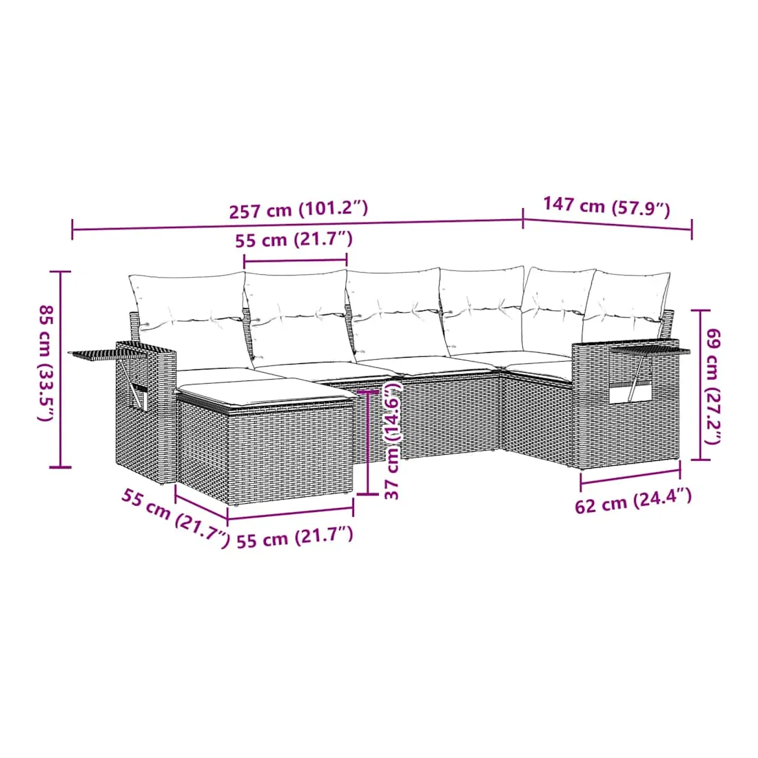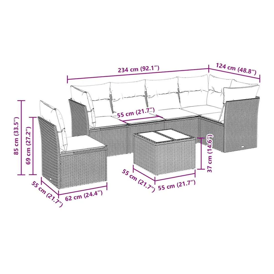 - Dimensions totales du canapé 5 places : 234 x 124 x 69 cm (l x P x H)