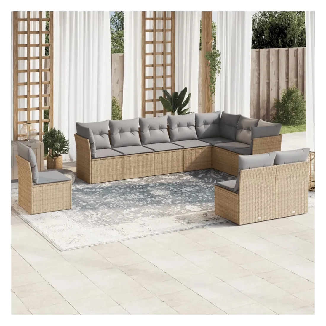 Cet ensemble de canapés de jardin est le complément parfait de votre arrière-cour, terrasse ou patio, offrant un espace confortable et accueillant pour discuter avec la famille et les amis ou simplement se détendre et profiter de l'extérieur. Matériau durable : la résine tressée, également connue sous le nom de poly rotin, est un matériau synthétique solide et nécessitant peu d'entretien qui ressemble au rotin naturel. Il est léger, facile à nettoyer et couramment utilisé pour les meubles d'extérieur en raison de sa durabilité et de ses propriétés de résistance aux intempéries.Fonction de rangement avec sac résistant à l'eau : chaque siège de jardin dispose d'un espace de rangement sous l'assise, complété par un sac résistant à l'eau pour ranger les coussins, les jouets et d'autres objets. Les sacs intérieurs sont dotés d'un couvercle et peuvent être solidement fixés aux sièges à l'aide de bandes auto-agrippantes pour plus de stabilité.Housse amovible et lavable : ces coussins de siège sont dotés de housses amovibles pour un lavage et un entretien faciles.Conception modulaire : cet ensemble de meubles d'extérieur a une conception modulaire, ce qui le rend complètement flexible et facile à déplacer, afin que vous puissiez créer un agencement de meubles d'extérieur personnalisé. Bon à savoir :Pour que vos meubles d'extérieur restent beaux, nous vous recommandons de les protéger avec une housse imperméable.