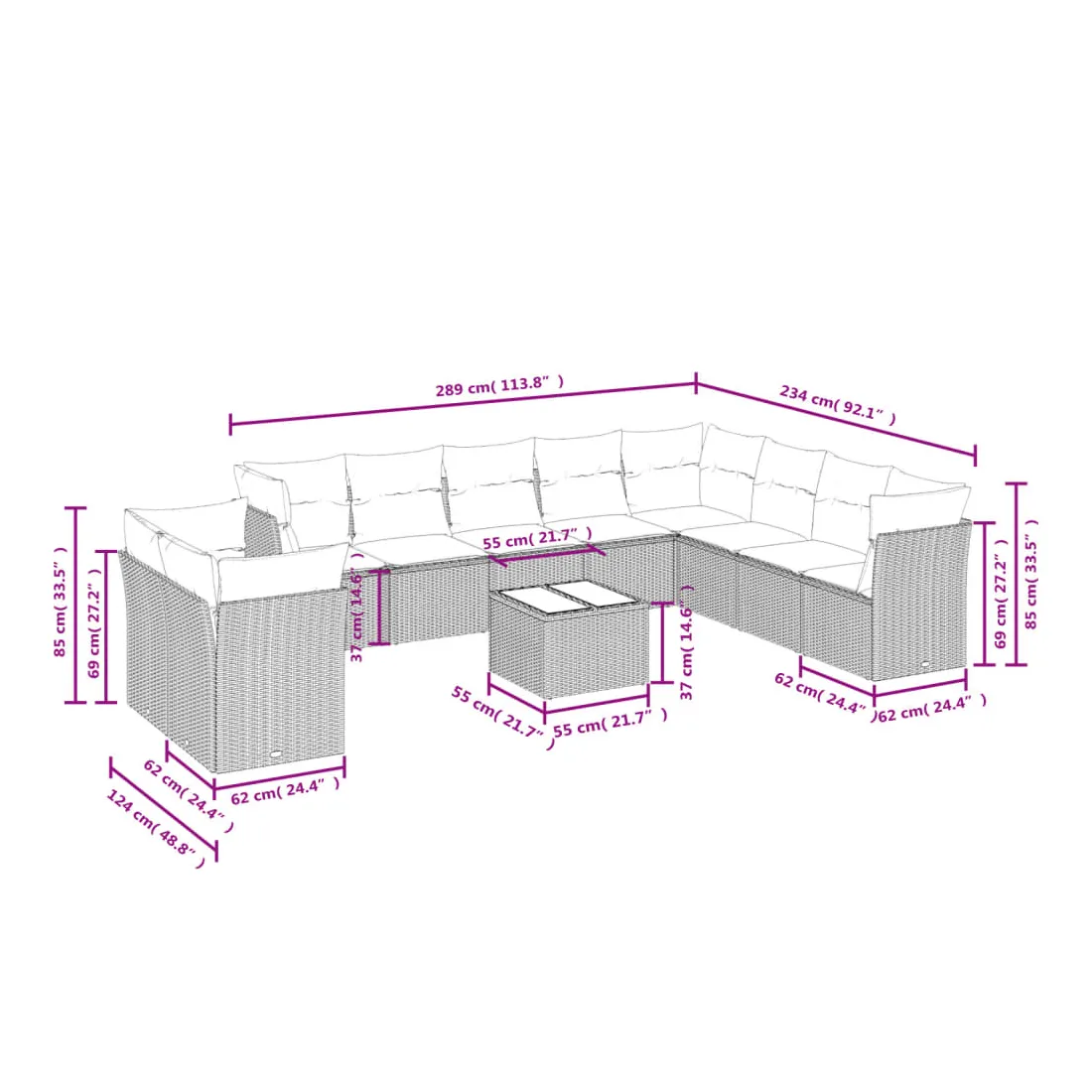 - Dimensions totales du canapé 8 places : 289 x 234 x 69 cm (l x P x H)