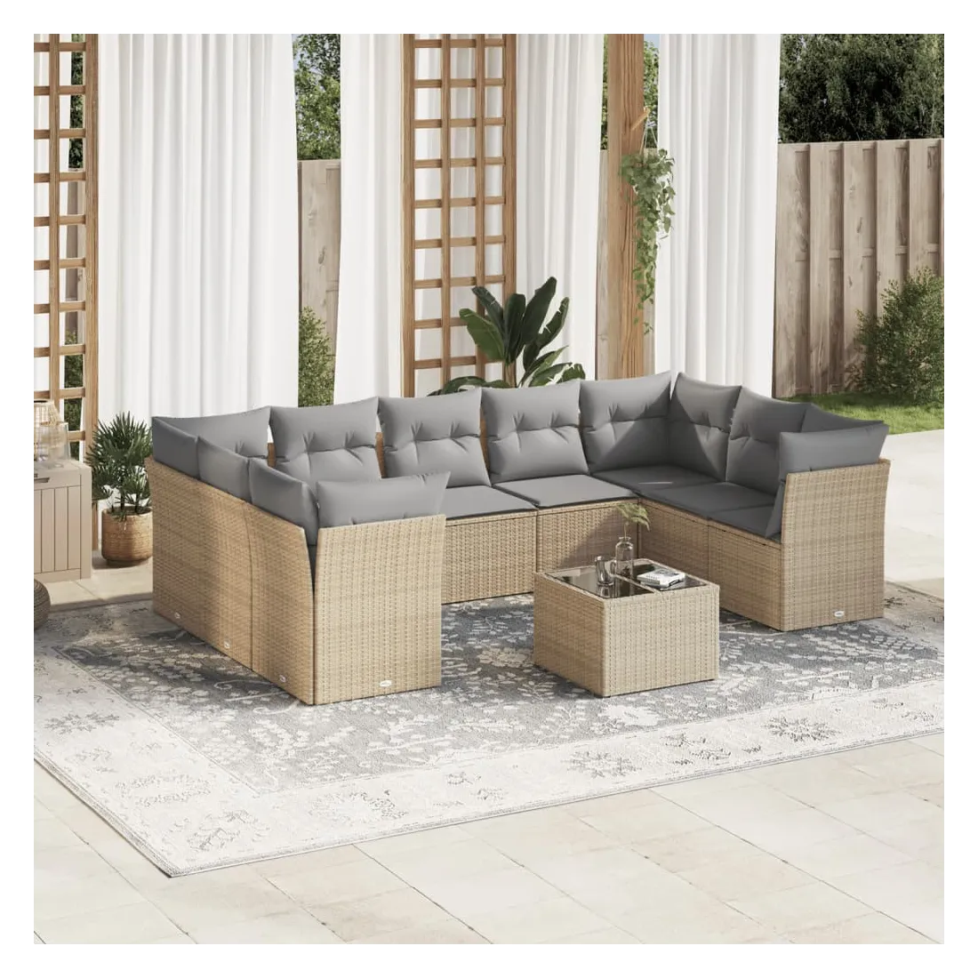 Cet ensemble de canapés de jardin est le complément parfait de votre arrière-cour, terrasse ou patio, offrant un espace confortable et accueillant pour discuter avec la famille et les amis ou simplement se détendre et profiter de l'extérieur. Matériau durable : la résine tressée, également connue sous le nom de poly rotin, est un matériau synthétique solide et nécessitant peu d'entretien qui ressemble au rotin naturel. Il est léger, facile à nettoyer et couramment utilisé pour les meubles d'extérieur en raison de sa durabilité et de ses propriétés de résistance aux intempéries.Fonction de rangement avec sac résistant à l'eau : chaque siège de jardin dispose d'un espace de rangement sous l'assise, complété par un sac résistant à l'eau pour ranger les coussins, les jouets et d'autres objets. Les sacs intérieurs sont dotés d'un couvercle et peuvent être solidement fixés aux sièges à l'aide de bandes auto-agrippantes pour plus de stabilité.Dessus en verre : le dessus de la table d'extérieur est fabriqué en verre trempé solide et durable, ce qui le rend facile à nettoyer avec un chiffon humide et ajoute une touche d'élégance à votre espace extérieur.Housse amovible et lavable : ces coussins de siège sont dotés de housses amovibles pour un lavage et un entretien faciles.Conception modulaire : cet ensemble de meubles d'extérieur a une conception modulaire, ce qui le rend complètement flexible et facile à déplacer, afin que vous puissiez créer un agencement de meubles d'extérieur personnalisé. Bon à savoir :Pour que vos meubles d'extérieur restent beaux, nous vous recommandons de les protéger avec une housse imperméable.