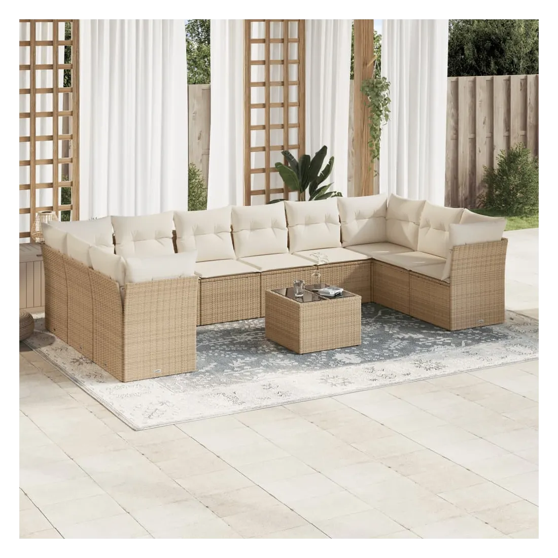 Cet ensemble de canapés de jardin est le complément parfait de votre arrière-cour, terrasse ou patio, offrant un espace confortable et accueillant pour discuter avec la famille et les amis ou simplement se détendre et profiter de l'extérieur. Matériau durable : la résine tressée, également connue sous le nom de poly rotin, est un matériau synthétique solide et nécessitant peu d'entretien qui ressemble au rotin naturel. Il est léger, facile à nettoyer et couramment utilisé pour les meubles d'extérieur en raison de sa durabilité et de ses propriétés de résistance aux intempéries.Fonction de rangement avec sac résistant à l'eau : chaque siège de jardin dispose d'un espace de rangement sous l'assise, complété par un sac résistant à l'eau pour ranger les coussins, les jouets et d'autres objets. Les sacs intérieurs sont dotés d'un couvercle et peuvent être solidement fixés aux sièges à l'aide de bandes auto-agrippantes pour plus de stabilité.Dessus en verre : le dessus de la table d'extérieur est fabriqué en verre trempé solide et durable, ce qui le rend facile à nettoyer avec un chiffon humide et ajoute une touche d'élégance à votre espace extérieur.Housse amovible et lavable : ces coussins de siège sont dotés de housses amovibles pour un lavage et un entretien faciles.Conception modulaire : cet ensemble de meubles d'extérieur a une conception modulaire, ce qui le rend complètement flexible et facile à déplacer, afin que vous puissiez créer un agencement de meubles d'extérieur personnalisé. Bon à savoir :Pour que vos meubles d'extérieur restent beaux, nous vous recommandons de les protéger avec une housse imperméable.