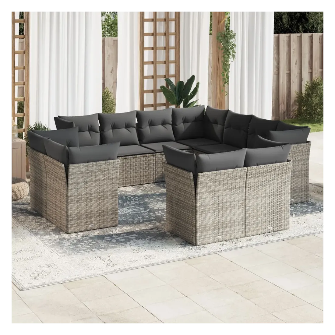 Cet ensemble de canapés de jardin est le complément parfait de votre arrière-cour, terrasse ou patio, offrant un espace confortable et accueillant pour discuter avec la famille et les amis ou simplement se détendre et profiter de l'extérieur. Matériau durable : la résine tressée, également connue sous le nom de poly rotin, est un matériau synthétique solide et nécessitant peu d'entretien qui ressemble au rotin naturel. Il est léger, facile à nettoyer et couramment utilisé pour les meubles d'extérieur en raison de sa durabilité et de ses propriétés de résistance aux intempéries.Fonction de rangement avec sac résistant à l'eau : chaque siège de jardin dispose d'un espace de rangement sous l'assise, complété par un sac résistant à l'eau pour ranger les coussins, les jouets et d'autres objets. Les sacs intérieurs sont dotés d'un couvercle et peuvent être solidement fixés aux sièges à l'aide de bandes auto-agrippantes pour plus de stabilité.Housse amovible et lavable : ces coussins de siège sont dotés de housses amovibles pour un lavage et un entretien faciles.Conception modulaire : cet ensemble de meubles d'extérieur a une conception modulaire, ce qui le rend complètement flexible et facile à déplacer, afin que vous puissiez créer un agencement de meubles d'extérieur personnalisé. Bon à savoir :Pour que vos meubles d'extérieur restent beaux, nous vous recommandons de les protéger avec une housse imperméable.