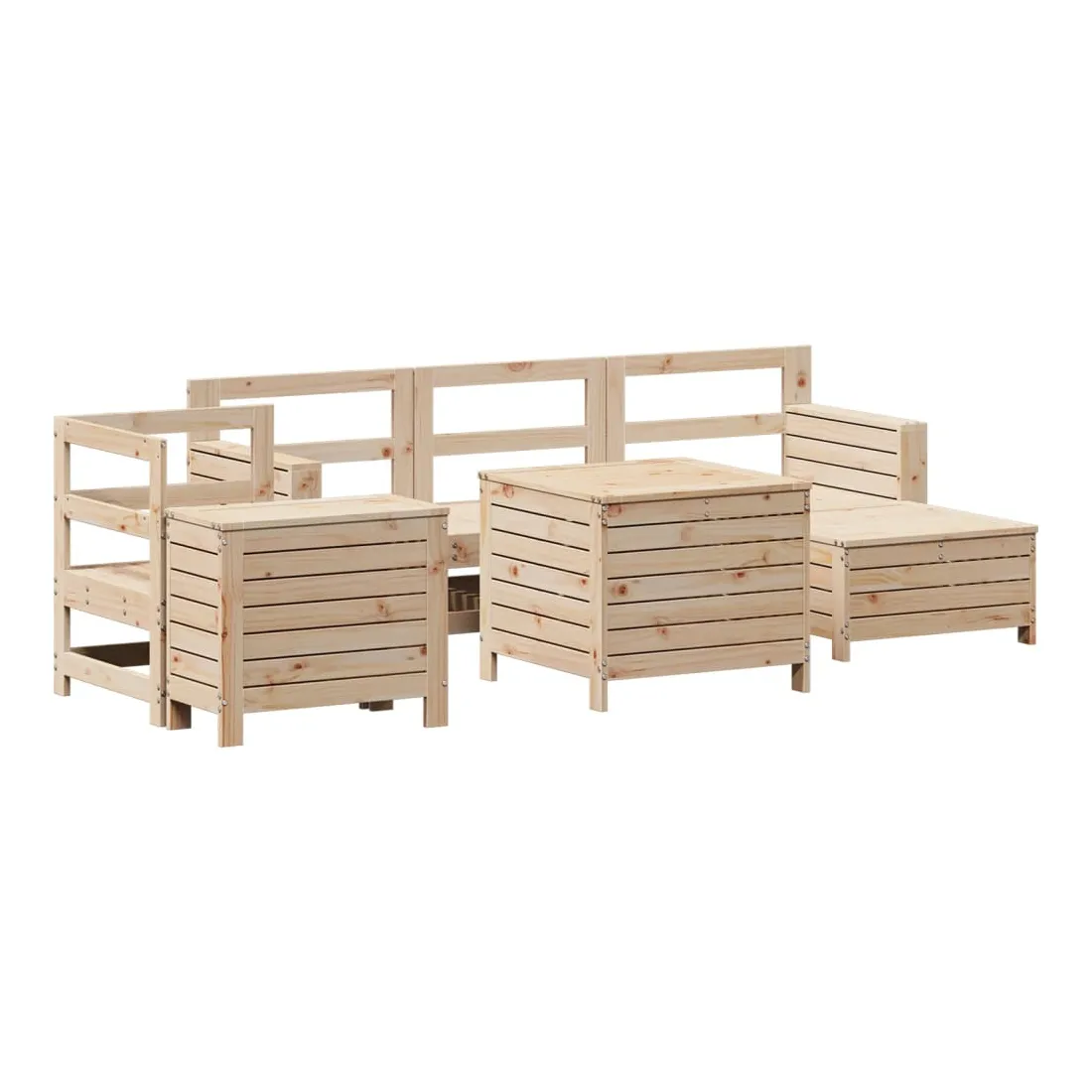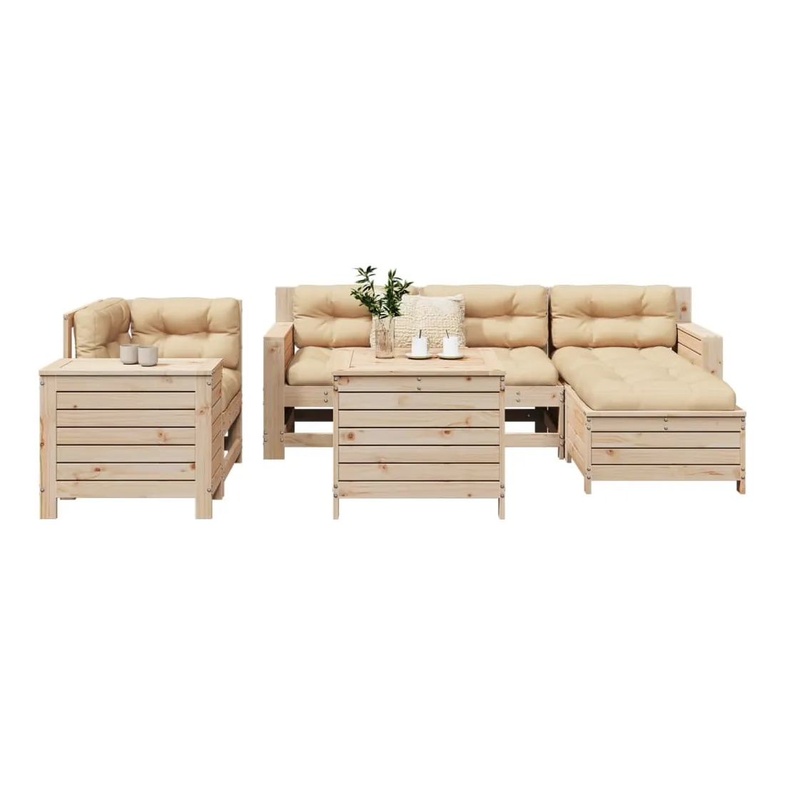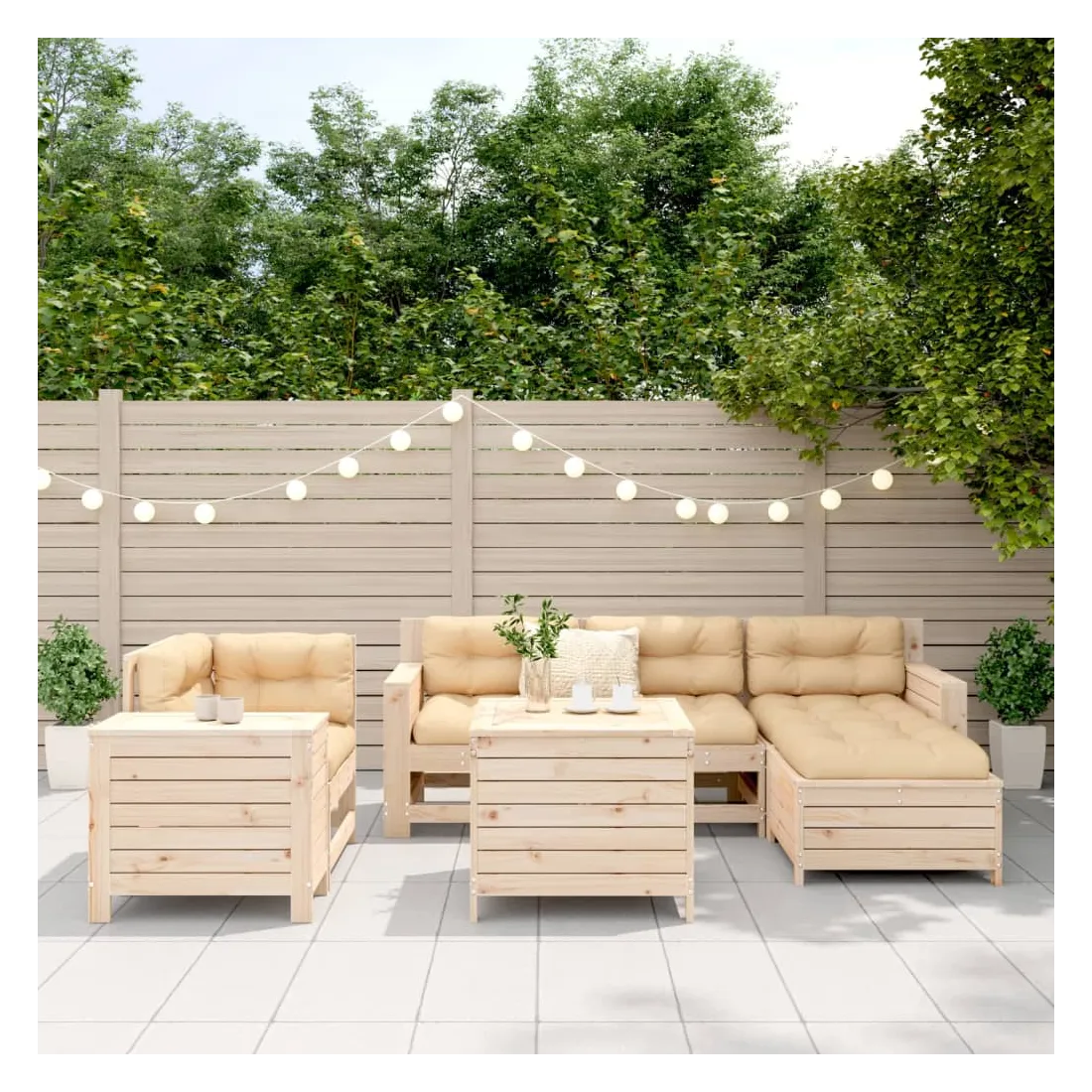 vidaXLCet ensemble de salon de jardin en bois avec un design à lattes sera un excellent complément à votre jardin, patio ou terrasse pour profiter d'un moment agréable avec votre famille ou vos amis. Matériau robuste et durable : le bois de pin massif est connu pour sa résistance et sa durabilité. Ses grains droits et ses nœuds distinctifs contribuent à son charme rustique. Bien ventilé et prévention de l'accumulation d'eau : la conception à lattes favorise une circulation optimale de l'air et empêche efficacement l'accumulation d'eau, assurant ainsi une assise sèche et confortable. Utilisation polyvalente : le repose-pied de jardin peut non seulement être utilisé pour s'asseoir ou se détendre, mais il peut également être utilisé comme table basse pour contenir vos boissons, votre nourriture et d'autres décorations. Table pratique : la table de jardin vous offre un endroit pratique pour atteindre facilement vos essentiels. De plus, le canapé avec accoudoirs est doté d'une table d'appoint pliable avec des ressorts à gaz sur l'accoudoir pour garder vos objets à portée de main. Conception modulaire : cet ensemble de meubles d'extérieur a une conception modulaire, ce qui le rend complètement flexible et facile à déplacer, afin que vous puissiez créer un agencement de meubles d'extérieur personnalisé. Bon à savoir :Pour que vos meubles d'extérieur restent beaux, nous vous recommandons de les protéger avec une housse imperméable.