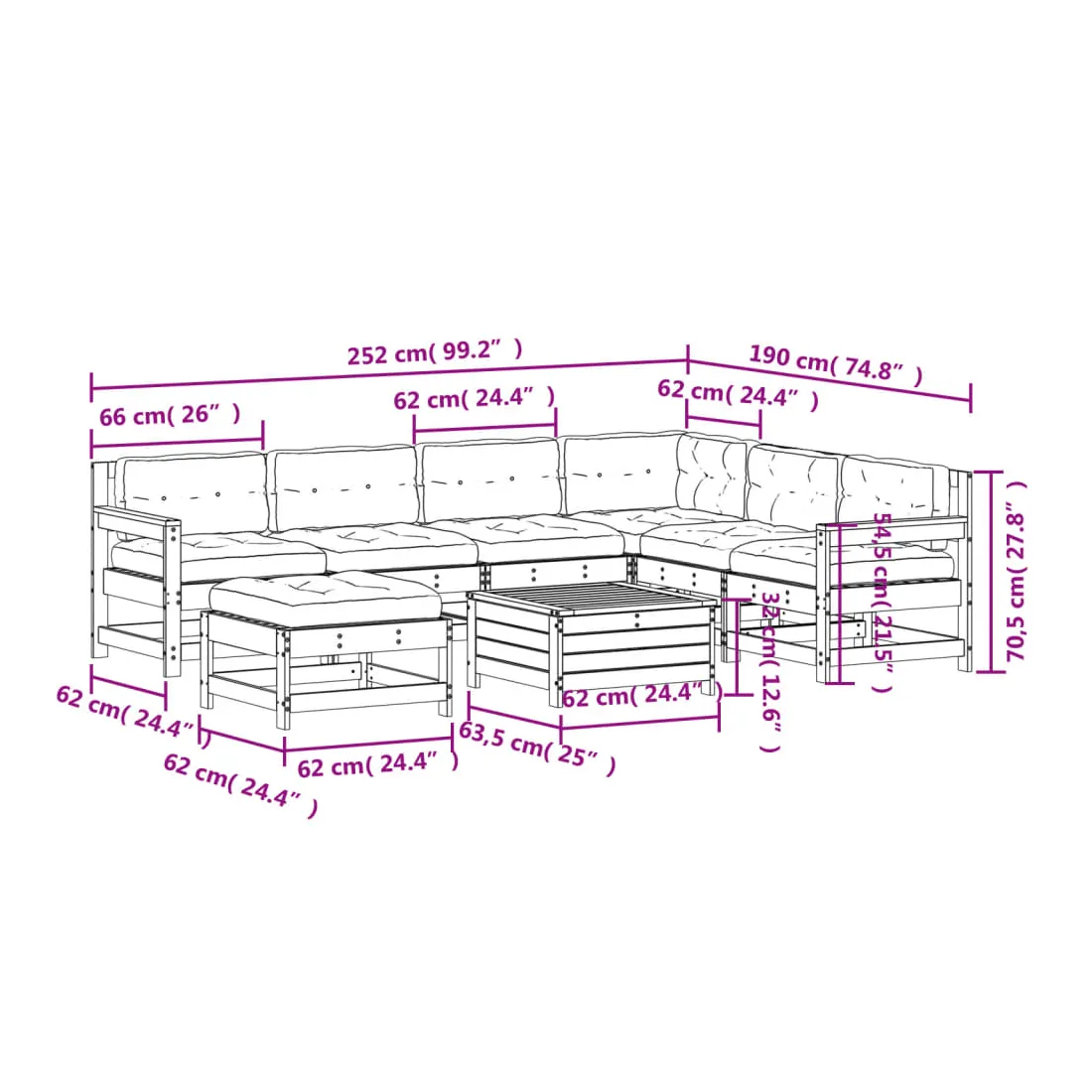- Dimensions du canapé d'angle de jardin : 62 x 62 x 70,5 cm (l x P x H)