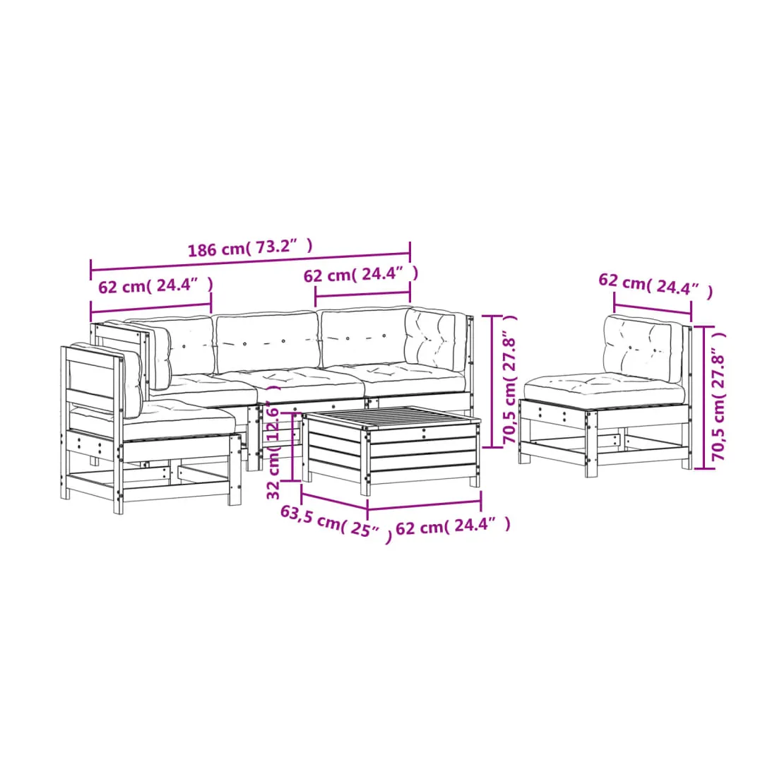 - Dimensions du canapé central de jardin : 62 x 62 x 70,5 cm (l x P x H)