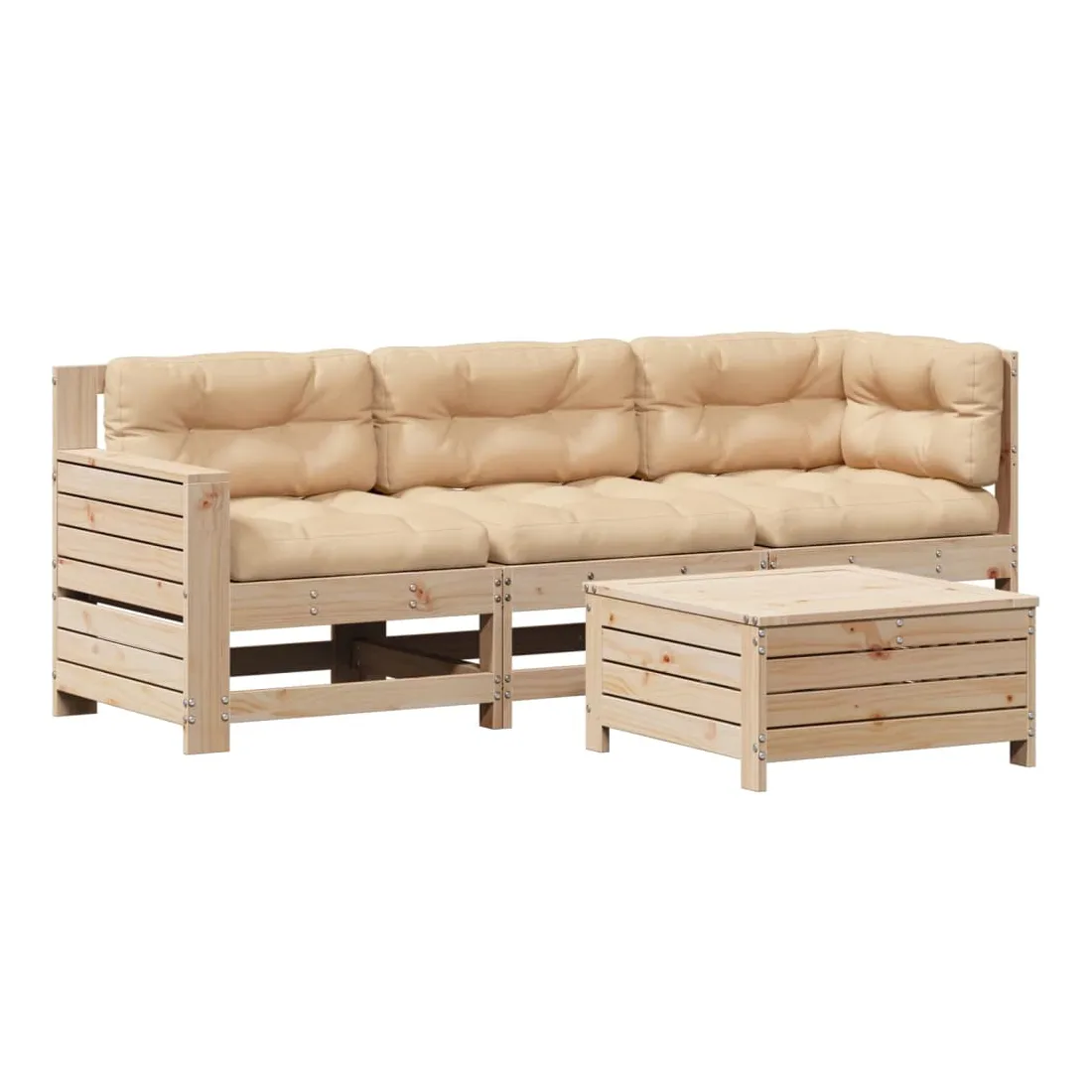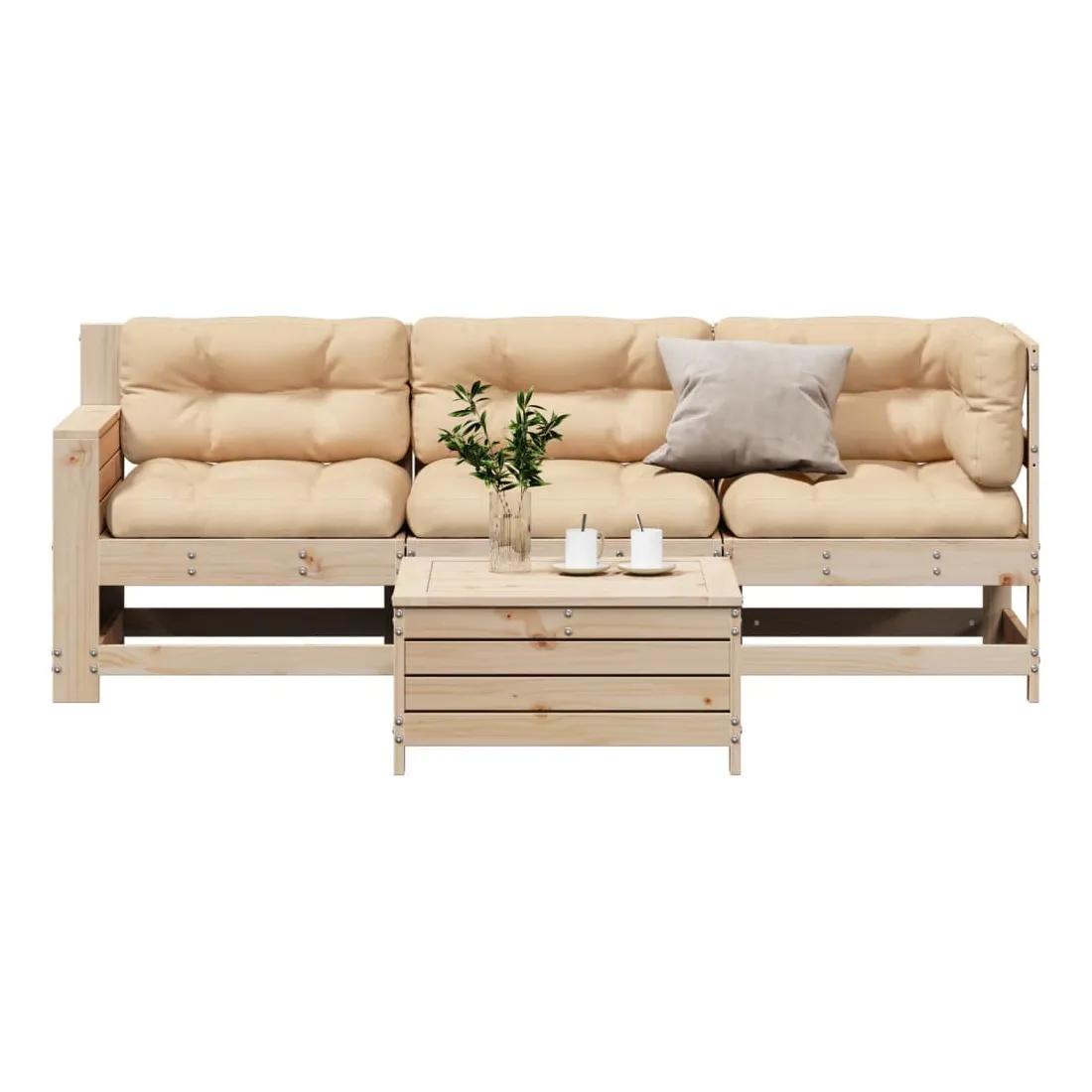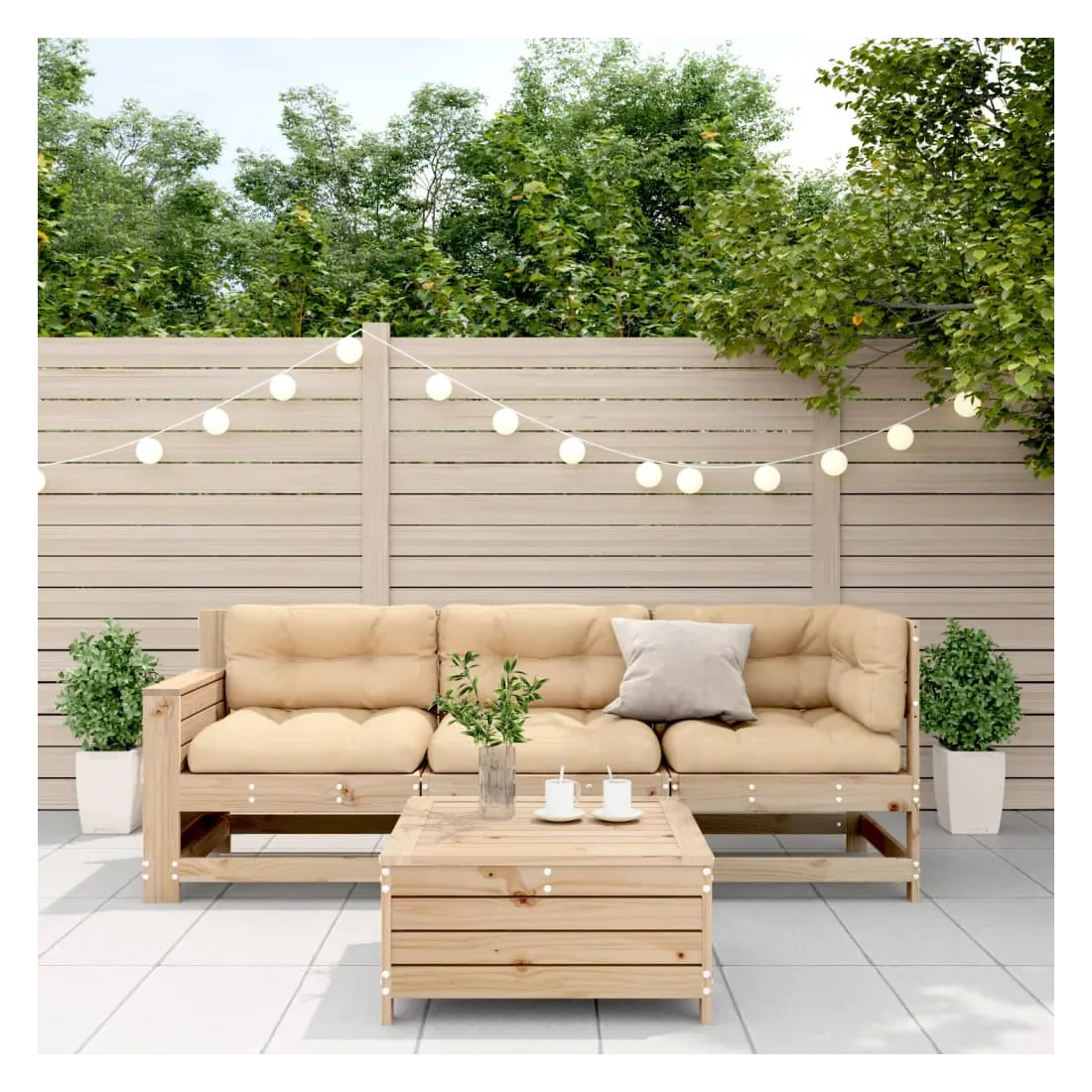 Cet ensemble de salon de jardin en bois avec un design à lattes sera un excellent complément à votre jardin, patio ou terrasse pour profiter d'un moment agréable avec votre famille ou vos amis. Bois de pin massif : le bois de pin massif est un matériau naturel magnifique. Le bois de pin a un grain droit et les nœuds donnent au matériau son aspect caractéristique et rustique.Expérience d'assise confortable : le dossier et l'accoudoir ajoutent un confort d'assise supplémentaire à l'ensemble de meubles de jardin. De plus, le coussin bien rembourré vous permet de vous asseoir confortablement.Utilisation polyvalente : le pouf d'extérieur avec couvercle peut non seulement être utilisé pour s'asseoir ou se détendre, mais il peut également être utilisé comme table basse pour contenir vos boissons, votre nourriture et le meuble de jardin dispose d'un espace de rangement sous le siège. Table d'appoint pratique : ce mobilier d'extérieur comprend une table d'appoint pliable avec un ressort à gaz sur les accoudoirs, offrant un endroit pratique pour garder vos essentiels à portée de main.Conception modulaire : cet ensemble de meubles d'extérieur a une conception modulaire, ce qui le rend complètement flexible et facile à déplacer, afin que vous puissiez créer un agencement de meubles d'extérieur personnalisé. Bon à savoir :Pour que vos meubles d'extérieur restent beaux, nous vous recommandons de les protéger avec une housse imperméable.
