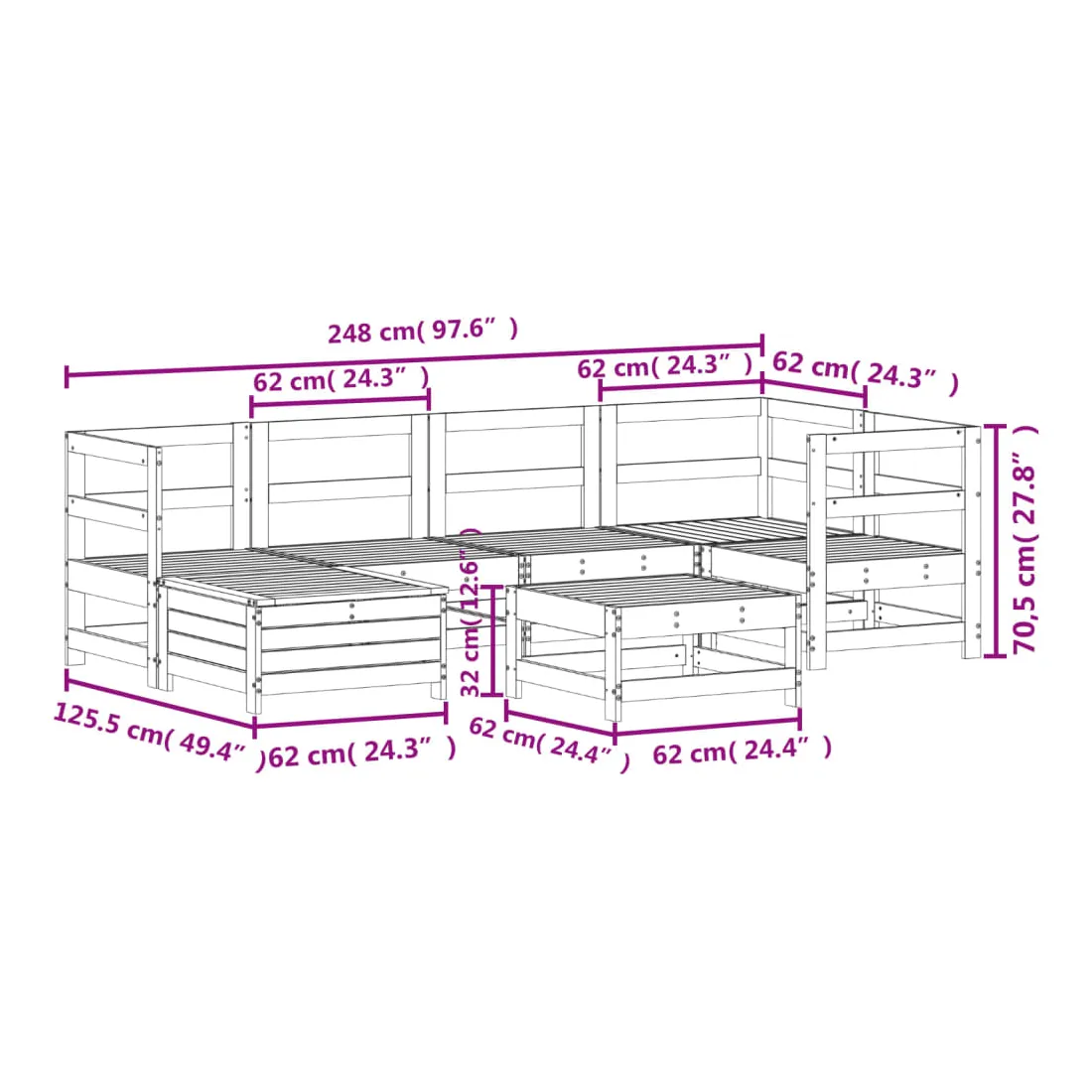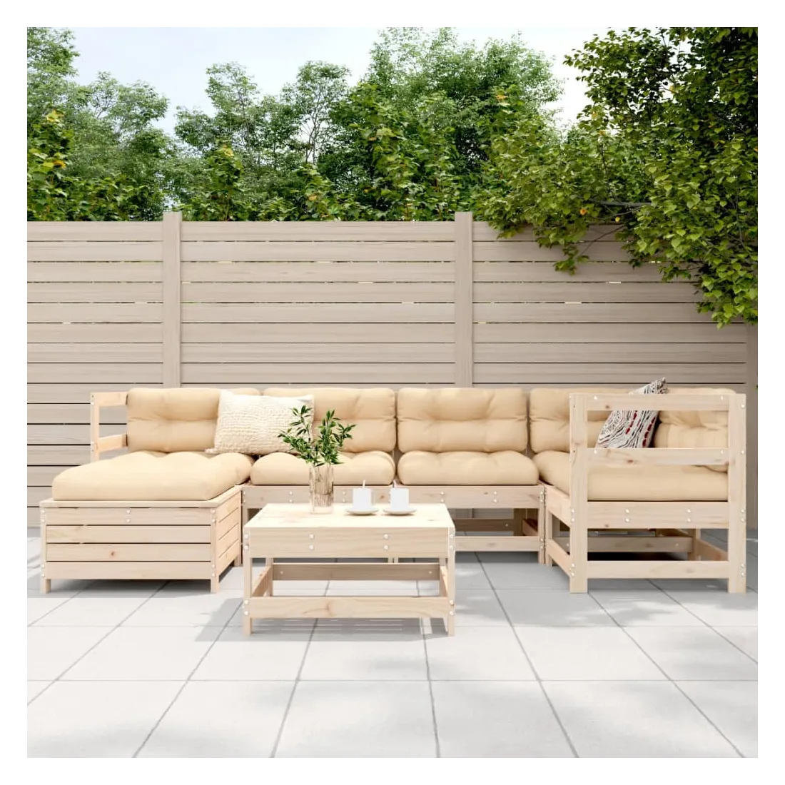 Cet ensemble de salon de jardin en bois avec un design à lattes sera un excellent complément à votre jardin, patio ou terrasse pour profiter d'un moment agréable avec votre famille ou vos amis. Matériau robuste et durable : le bois de pin massif est connu pour sa résistance et sa durabilité. Ses grains droits et ses nœuds distinctifs contribuent à son charme rustique. Bien ventilé et prévention de l'accumulation d'eau : la conception à lattes favorise une circulation optimale de l'air et empêche efficacement l'accumulation d'eau, assurant ainsi une assise sèche et confortable. Utilisation polyvalente : le repose-pied de jardin peut non seulement être utilisé pour s'asseoir ou se détendre, mais il peut également être utilisé comme table basse pour contenir vos boissons, votre nourriture et d'autres décorations. Conception modulaire : cet ensemble de meubles d'extérieur a une conception modulaire, ce qui le rend complètement flexible et facile à déplacer, afin que vous puissiez créer un agencement de meubles d'extérieur personnalisé. Bon à savoir :Pour que vos meubles d'extérieur restent beaux, nous vous recommandons de les protéger avec une housse imperméable.