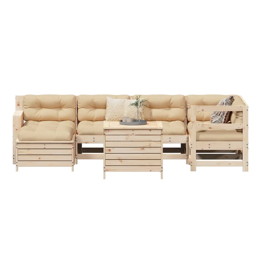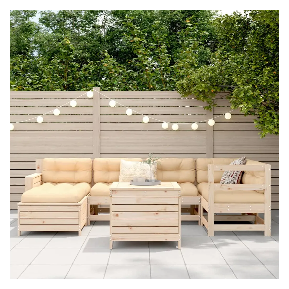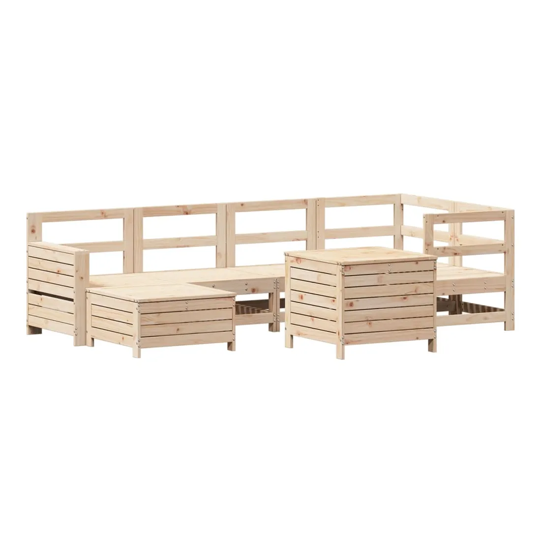 vidaXLCet ensemble de salon de jardin en bois avec un design à lattes sera un excellent complément à votre jardin, patio ou terrasse pour profiter d'un moment agréable avec votre famille ou vos amis. Matériau robuste et durable : le bois de pin massif est connu pour sa résistance et sa durabilité. Ses grains droits et ses nœuds distinctifs contribuent à son charme rustique. Bien ventilé et prévention de l'accumulation d'eau : la conception à lattes favorise une circulation optimale de l'air et empêche efficacement l'accumulation d'eau, assurant ainsi une assise sèche et confortable. Utilisation polyvalente : le repose-pied de jardin peut non seulement être utilisé pour s'asseoir ou se détendre, mais il peut également être utilisé comme table basse pour contenir vos boissons, votre nourriture et d'autres décorations. Table pratique : la table de jardin vous offre un endroit pratique pour atteindre facilement vos essentiels. De plus, le canapé avec accoudoirs est doté d'une table d'appoint pliable avec des ressorts à gaz sur l'accoudoir pour garder vos objets à portée de main. Conception modulaire : cet ensemble de meubles d'extérieur a une conception modulaire, ce qui le rend complètement flexible et facile à déplacer, afin que vous puissiez créer un agencement de meubles d'extérieur personnalisé. Bon à savoir :Pour que vos meubles d'extérieur restent beaux, nous vous recommandons de les protéger avec une housse imperméable.