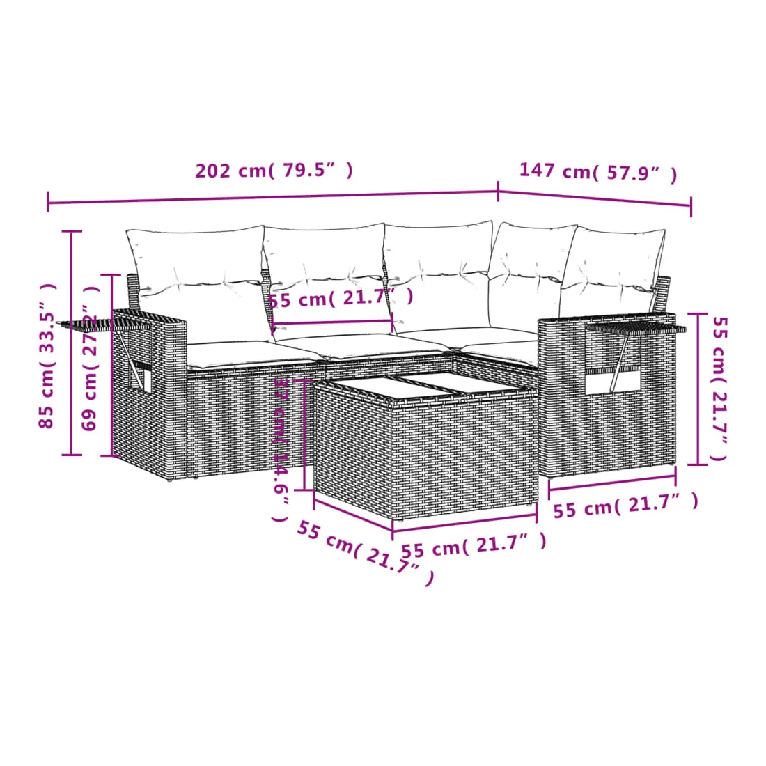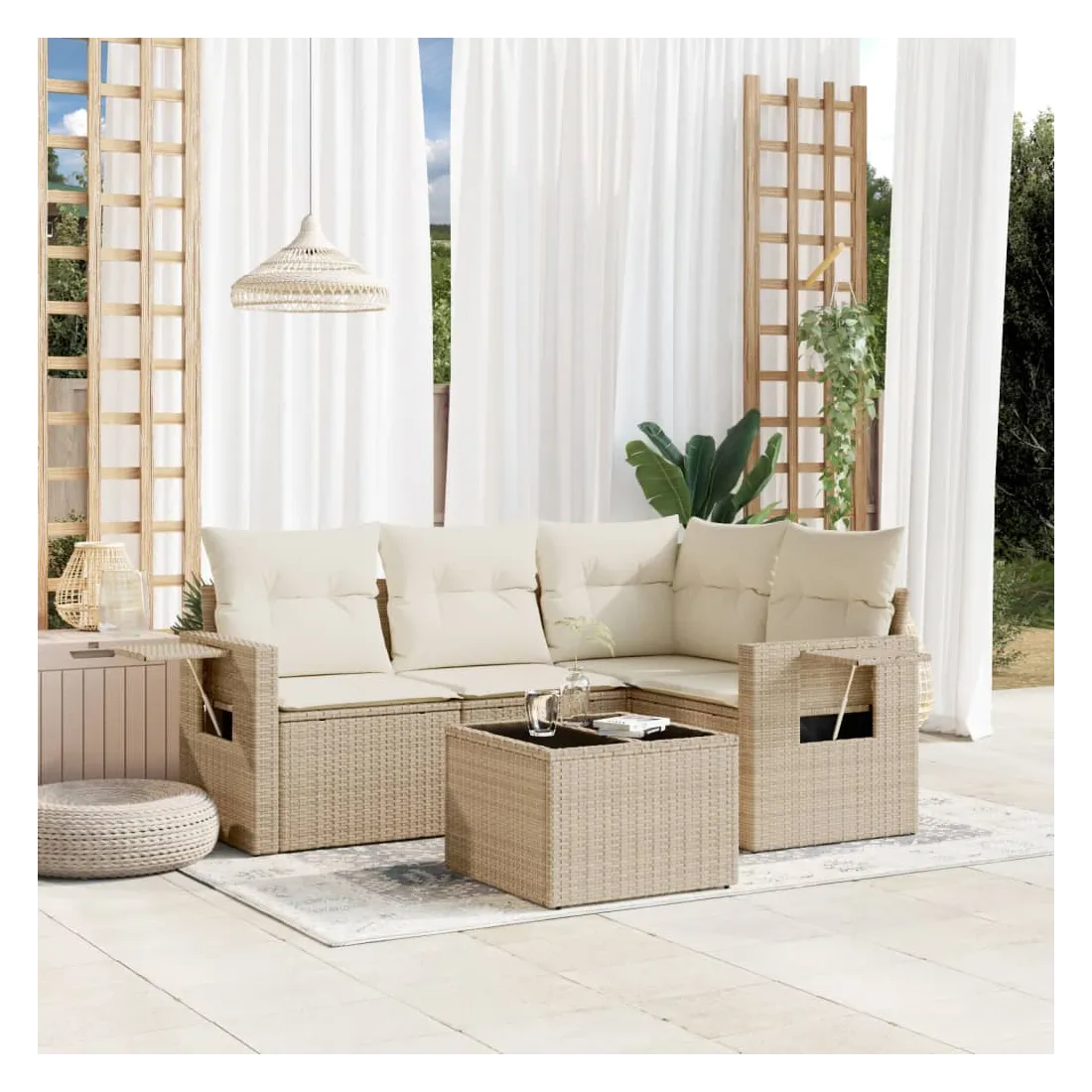 Cet ensemble de canapés de jardin est le complément parfait de votre arrière-cour, terrasse ou patio, offrant un espace confortable et accueillant pour discuter avec la famille et les amis ou simplement se détendre et profiter de l'extérieur. Matériau durable : la résine tressée, également connue sous le nom de poly rotin, est un matériau synthétique solide et nécessitant peu d'entretien qui ressemble au rotin naturel. Il est léger, facile à nettoyer et couramment utilisé pour les meubles d'extérieur en raison de sa durabilité et de ses propriétés de résistance aux intempéries.Fonction de rangement avec sac résistant à l'eau : le mobilier de jardin dispose d'un espace de rangement sous l'assise, complété par un sac résistant à l'eau pour ranger coussins, jouets et autres objets. Le sac intérieur peut être solidement fixé au mobilier d'extérieur grâce à des attaches auto-agrippantes pour plus de stabilité.Table d'appoint pratique : ce mobilier d'extérieur comprend une table d'appoint pliable avec un ressort à gaz sur les accoudoirs, offrant un endroit pratique pour garder vos essentiels à portée de main.Housse amovible et lavable : ces coussins de siège sont dotés de housses amovibles pour un lavage et un entretien faciles.Conception modulaire : cet ensemble de meubles d'extérieur a une conception modulaire, ce qui le rend complètement flexible et facile à déplacer, afin que vous puissiez créer un agencement de meubles d'extérieur personnalisé. Bon à savoir :Pour que vos meubles d'extérieur restent beaux, nous vous recommandons de les protéger avec une housse imperméable.