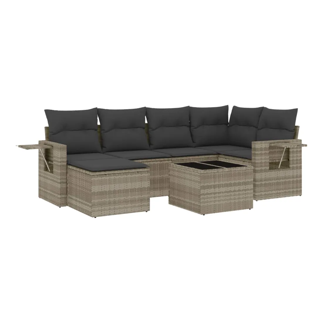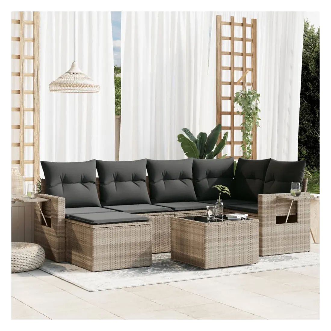 Cet ensemble de canapés de jardin est le complément parfait de votre arrière-cour, terrasse ou patio, offrant un espace confortable et accueillant pour discuter avec la famille et les amis ou simplement se détendre et profiter de l'extérieur. Matériau durable : la résine tressée, également connue sous le nom de poly rotin, est un matériau synthétique solide et nécessitant peu d'entretien qui ressemble au rotin naturel. Il est léger, facile à nettoyer et couramment utilisé pour les meubles d'extérieur en raison de sa durabilité et de ses propriétés de résistance aux intempéries.Fonction de rangement avec sac résistant à l'eau : le mobilier de jardin dispose d'un espace de rangement sous l'assise, complété par un sac résistant à l'eau pour ranger coussins, jouets et autres objets. Le sac intérieur peut être solidement fixé au mobilier d'extérieur grâce à des attaches auto-agrippantes pour plus de stabilité.Table d'appoint pratique : ce mobilier d'extérieur comprend une table d'appoint pliable avec un ressort à gaz sur les accoudoirs, offrant un endroit pratique pour garder vos essentiels à portée de main.Housse amovible et lavable : ces coussins de siège sont dotés de housses amovibles pour un lavage et un entretien faciles.Conception modulaire : cet ensemble de meubles d'extérieur a une conception modulaire, ce qui le rend complètement flexible et facile à déplacer, afin que vous puissiez créer un agencement de meubles d'extérieur personnalisé. Bon à savoir :Pour que vos meubles d'extérieur restent beaux, nous vous recommandons de les protéger avec une housse imperméable.