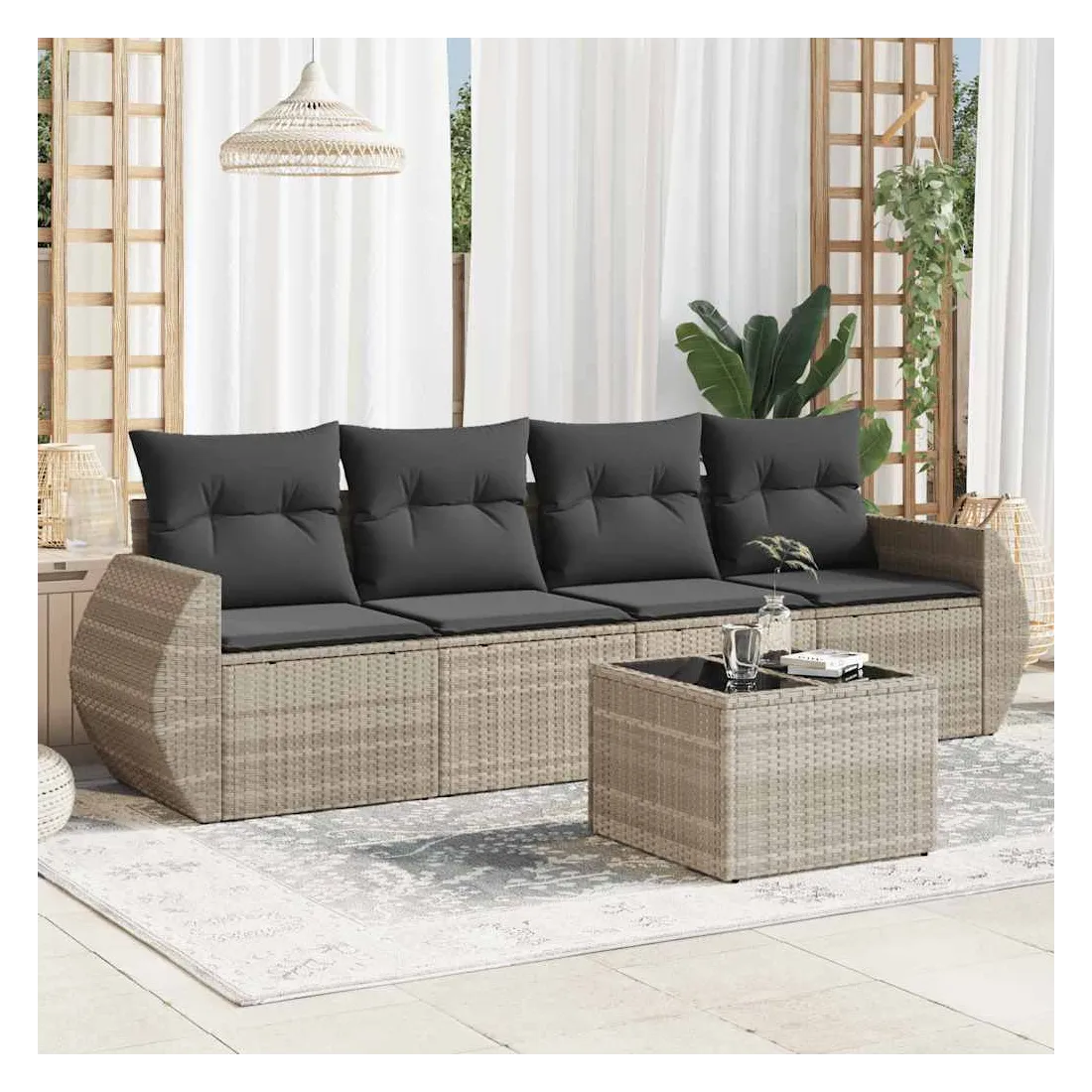 Cet ensemble de canapés de jardin est le complément parfait de votre arrière-cour, terrasse ou patio, offrant un espace confortable et accueillant pour discuter avec la famille et les amis ou simplement se détendre et profiter de l'extérieur. Matériau durable : la résine tressée, également connue sous le nom de poly rotin, est un matériau synthétique solide et nécessitant peu d'entretien qui ressemble au rotin naturel. Il est léger, facile à nettoyer et couramment utilisé pour les meubles d'extérieur en raison de sa durabilité et de ses propriétés de résistance aux intempéries.Fonction de rangement avec sac résistant à l'eau : chaque siège de jardin dispose d'un espace de rangement sous l'assise, complété par un sac résistant à l'eau pour ranger les coussins, les jouets et d'autres objets. Les sacs intérieurs sont dotés d'un couvercle et peuvent être solidement fixés aux sièges à l'aide de bandes auto-agrippantes pour plus de stabilité.Dessus en verre : le dessus de la table d'extérieur est fabriqué en verre trempé solide et durable, ce qui le rend facile à nettoyer avec un chiffon humide et ajoute une touche d'élégance à votre espace extérieur.Housse amovible et lavable : ces coussins de siège sont dotés de housses amovibles pour un lavage et un entretien faciles.Conception modulaire : cet ensemble de meubles d'extérieur a une conception modulaire, ce qui le rend complètement flexible et facile à déplacer, afin que vous puissiez créer un agencement de meubles d'extérieur personnalisé. Bon à savoir :Pour que vos meubles d'extérieur restent beaux, nous vous recommandons de les protéger avec une housse imperméable.
