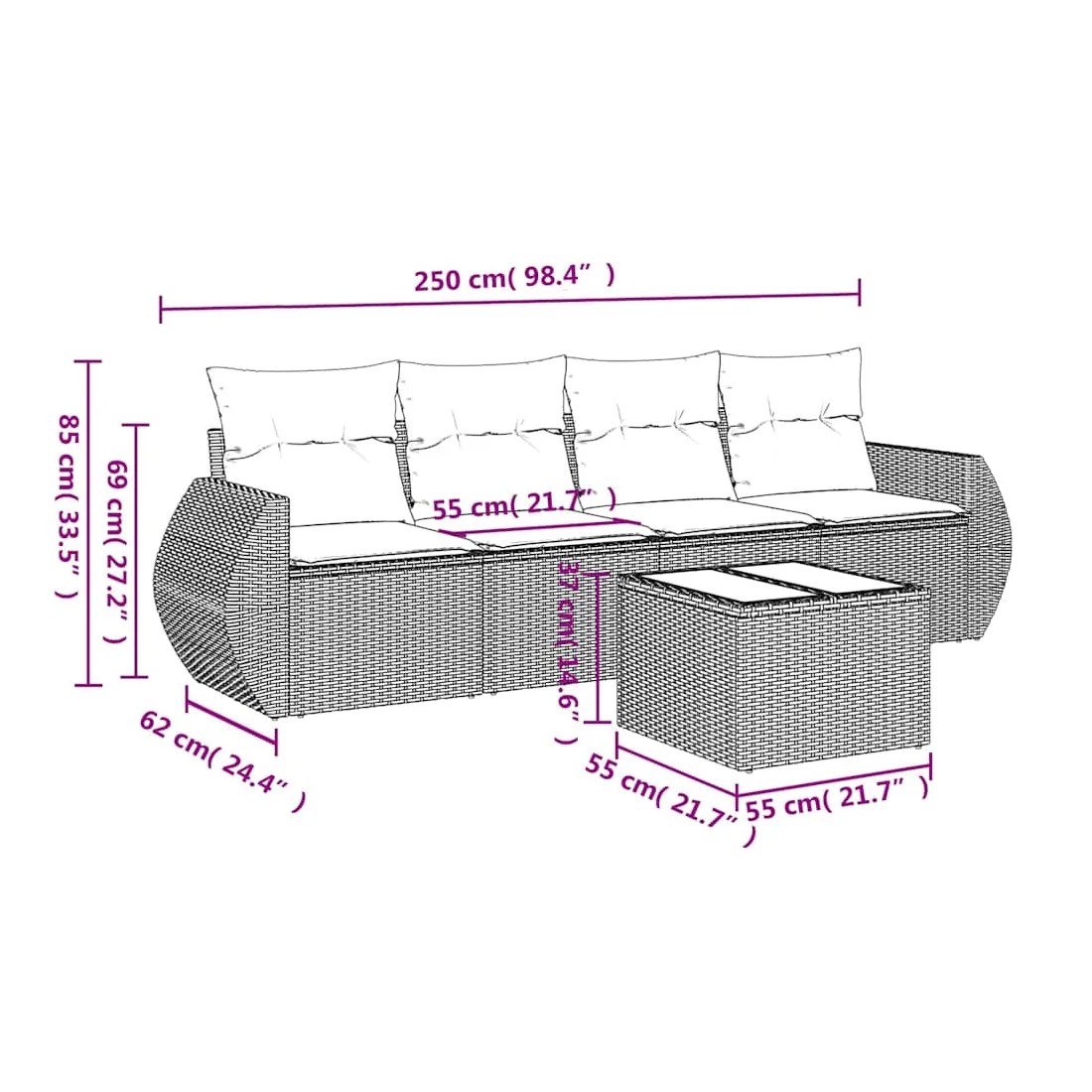 - Dimensions totales du canapé : 250 x 62 x 69 cm (l x P x H)