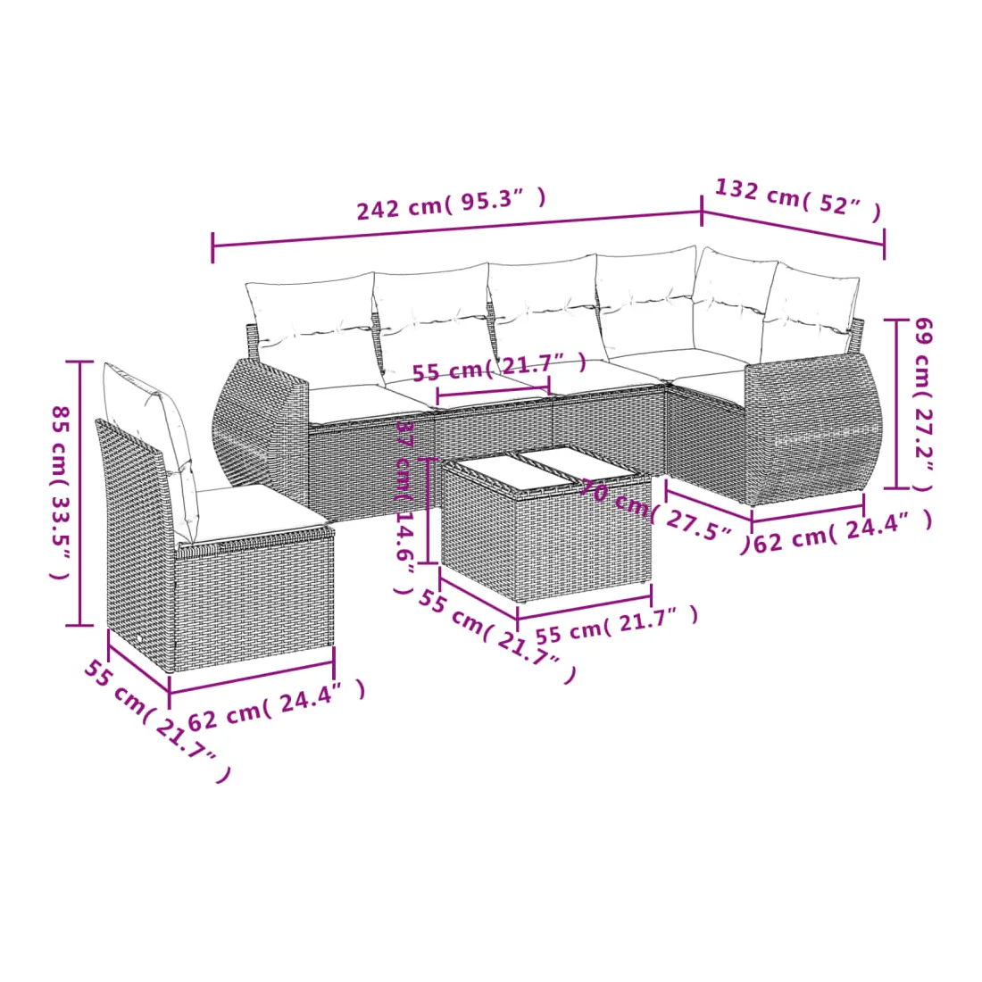 Cet ensemble de canapés de jardin est le complément parfait de votre arrière-cour, terrasse ou patio, offrant un espace confortable et accueillant pour discuter avec la famille et les amis ou simplement se détendre et profiter de l'extérieur. Matériau durable : la résine tressée, également connue sous le nom de poly rotin, est un matériau synthétique solide et nécessitant peu d'entretien qui ressemble au rotin naturel. Il est léger, facile à nettoyer et couramment utilisé pour les meubles d'extérieur en raison de sa durabilité et de ses propriétés de résistance aux intempéries.Fonction de rangement avec sac résistant à l'eau : chaque siège de jardin dispose d'un espace de rangement sous l'assise, complété par un sac résistant à l'eau pour ranger les coussins, les jouets et d'autres objets. Les sacs intérieurs sont dotés d'un couvercle et peuvent être solidement fixés aux sièges à l'aide de bandes auto-agrippantes pour plus de stabilité.Dessus en verre : le dessus de la table d'extérieur est fabriqué en verre trempé solide et durable, ce qui le rend facile à nettoyer avec un chiffon humide et ajoute une touche d'élégance à votre espace extérieur.Housse amovible et lavable : ces coussins de siège sont dotés de housses amovibles pour un lavage et un entretien faciles.Conception modulaire : cet ensemble de meubles d'extérieur a une conception modulaire, ce qui le rend complètement flexible et facile à déplacer, afin que vous puissiez créer un agencement de meubles d'extérieur personnalisé. Bon à savoir :Pour que vos meubles d'extérieur restent beaux, nous vous recommandons de les protéger avec une housse imperméable.