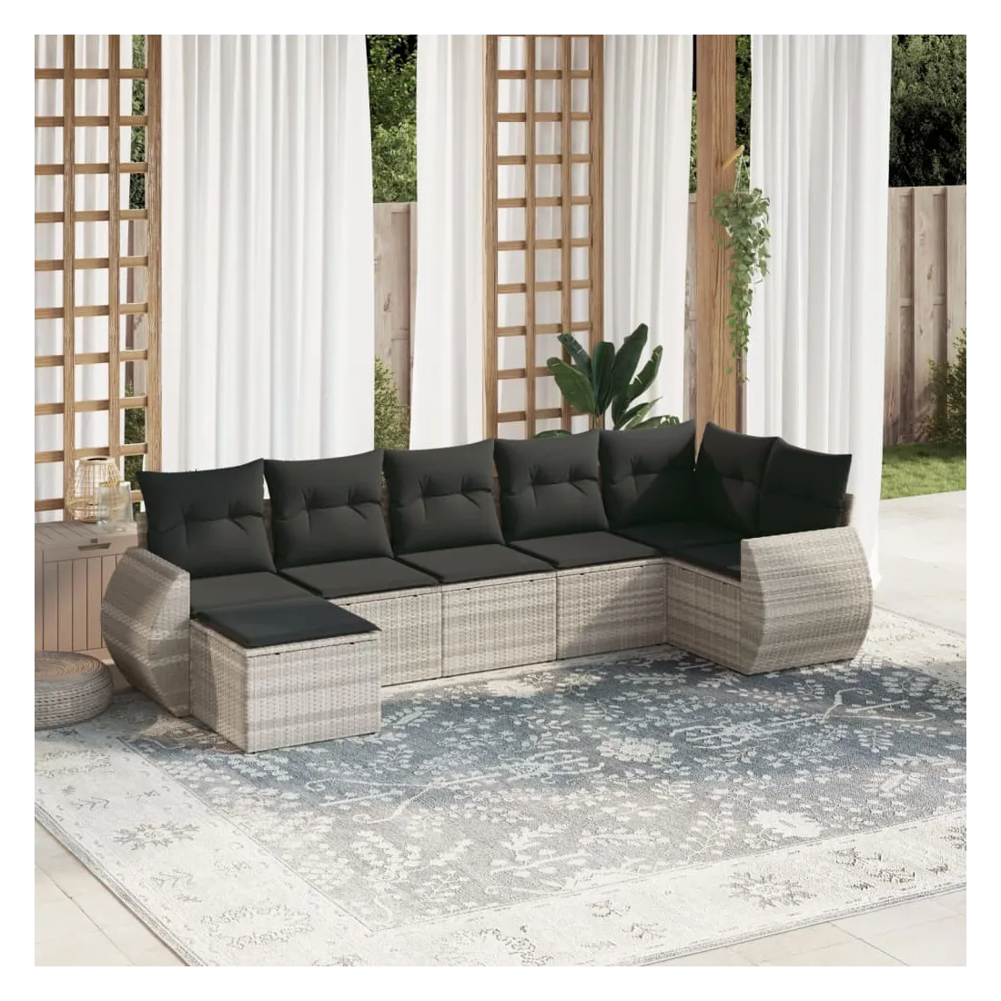 Cet ensemble de canapés de jardin est le complément parfait de votre arrière-cour, terrasse ou patio, offrant un espace confortable et accueillant pour discuter avec la famille et les amis ou simplement se détendre et profiter de l'extérieur. Matériau durable : la résine tressée, également connue sous le nom de poly rotin, est un matériau synthétique solide et nécessitant peu d'entretien qui ressemble au rotin naturel. Il est léger, facile à nettoyer et couramment utilisé pour les meubles d'extérieur en raison de sa durabilité et de ses propriétés de résistance aux intempéries.Fonction de rangement avec sac résistant à l'eau : chaque siège de jardin dispose d'un espace de rangement sous l'assise, complété par un sac résistant à l'eau pour ranger les coussins, les jouets et d'autres objets. Les sacs intérieurs sont dotés d'un couvercle et peuvent être solidement fixés aux sièges à l'aide de bandes auto-agrippantes pour plus de stabilité.Housse amovible et lavable : ces coussins de siège sont dotés de housses amovibles pour un lavage et un entretien faciles.Conception modulaire : cet ensemble de meubles d'extérieur a une conception modulaire, ce qui le rend complètement flexible et facile à déplacer, afin que vous puissiez créer un agencement de meubles d'extérieur personnalisé. Bon à savoir :Pour que vos meubles d'extérieur restent beaux, nous vous recommandons de les protéger avec une housse imperméable.