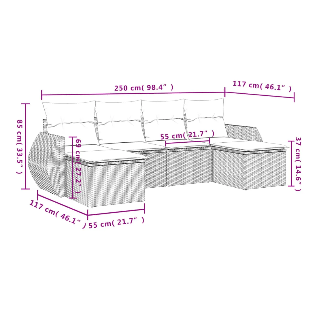 Cet ensemble de canapés de jardin est le complément parfait de votre arrière-cour, terrasse ou patio, offrant un espace confortable et accueillant pour discuter avec la famille et les amis ou simplement se détendre et profiter de l'extérieur. Matériau durable : la résine tressée, également connue sous le nom de poly rotin, est un matériau synthétique solide et nécessitant peu d'entretien qui ressemble au rotin naturel. Il est léger, facile à nettoyer et couramment utilisé pour les meubles d'extérieur en raison de sa durabilité et de ses propriétés de résistance aux intempéries.Fonction de rangement avec sac résistant à l'eau : chaque siège de jardin dispose d'un espace de rangement sous l'assise, complété par un sac résistant à l'eau pour ranger les coussins, les jouets et d'autres objets. Les sacs intérieurs sont dotés d'un couvercle et peuvent être solidement fixés aux sièges à l'aide de bandes auto-agrippantes pour plus de stabilité.Housse amovible et lavable : ces coussins de siège sont dotés de housses amovibles pour un lavage et un entretien faciles.Conception modulaire : cet ensemble de meubles d'extérieur a une conception modulaire, ce qui le rend complètement flexible et facile à déplacer, afin que vous puissiez créer un agencement de meubles d'extérieur personnalisé. Bon à savoir :Pour que vos meubles d'extérieur restent beaux, nous vous recommandons de les protéger avec une housse imperméable.