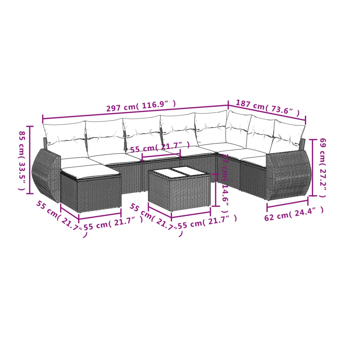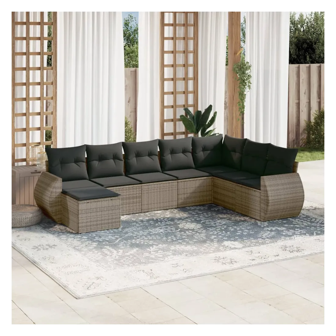 Cet ensemble de canapés de jardin est le complément parfait de votre arrière-cour, terrasse ou patio, offrant un espace confortable et accueillant pour discuter avec la famille et les amis ou simplement se détendre et profiter de l'extérieur. Matériau durable : la résine tressée, également connue sous le nom de poly rotin, est un matériau synthétique solide et nécessitant peu d'entretien qui ressemble au rotin naturel. Il est léger, facile à nettoyer et couramment utilisé pour les meubles d'extérieur en raison de sa durabilité et de ses propriétés de résistance aux intempéries.Fonction de rangement avec sac résistant à l'eau : chaque siège de jardin dispose d'un espace de rangement sous l'assise, complété par un sac résistant à l'eau pour ranger les coussins, les jouets et d'autres objets. Les sacs intérieurs sont dotés d'un couvercle et peuvent être solidement fixés aux sièges à l'aide de bandes auto-agrippantes pour plus de stabilité.Housse amovible et lavable : ces coussins de siège sont dotés de housses amovibles pour un lavage et un entretien faciles.Conception modulaire : cet ensemble de meubles d'extérieur a une conception modulaire, ce qui le rend complètement flexible et facile à déplacer, afin que vous puissiez créer un agencement de meubles d'extérieur personnalisé. Bon à savoir :Pour que vos meubles d'extérieur restent beaux, nous vous recommandons de les protéger avec une housse imperméable.