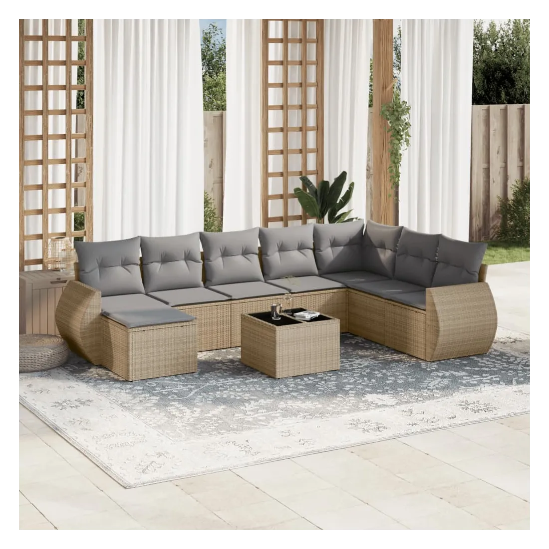 Cet ensemble de canapés de jardin est le complément parfait de votre arrière-cour, terrasse ou patio, offrant un espace confortable et accueillant pour discuter avec la famille et les amis ou simplement se détendre et profiter de l'extérieur. Matériau durable : la résine tressée, également connue sous le nom de poly rotin, est un matériau synthétique solide et nécessitant peu d'entretien qui ressemble au rotin naturel. Il est léger, facile à nettoyer et couramment utilisé pour les meubles d'extérieur en raison de sa durabilité et de ses propriétés de résistance aux intempéries.Fonction de rangement avec sac résistant à l'eau : chaque siège de jardin dispose d'un espace de rangement sous l'assise, complété par un sac résistant à l'eau pour ranger les coussins, les jouets et d'autres objets. Les sacs intérieurs sont dotés d'un couvercle et peuvent être solidement fixés aux sièges à l'aide de bandes auto-agrippantes pour plus de stabilité.Dessus en verre : le dessus de la table d'extérieur est fabriqué en verre trempé solide et durable, ce qui le rend facile à nettoyer avec un chiffon humide et ajoute une touche d'élégance à votre espace extérieur.Housse amovible et lavable : ces coussins de siège sont dotés de housses amovibles pour un lavage et un entretien faciles.Conception modulaire : cet ensemble de meubles d'extérieur a une conception modulaire, ce qui le rend complètement flexible et facile à déplacer, afin que vous puissiez créer un agencement de meubles d'extérieur personnalisé. Bon à savoir :Pour que vos meubles d'extérieur restent beaux, nous vous recommandons de les protéger avec une housse imperméable.