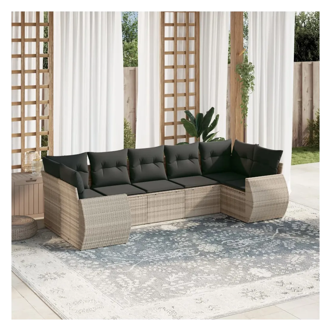 Cet ensemble de canapés de jardin est le complément parfait de votre arrière-cour, terrasse ou patio, offrant un espace confortable et accueillant pour discuter avec la famille et les amis ou simplement se détendre et profiter de l'extérieur. Matériau durable : la résine tressée, également connue sous le nom de poly rotin, est un matériau synthétique solide et nécessitant peu d'entretien qui ressemble au rotin naturel. Il est léger, facile à nettoyer et couramment utilisé pour les meubles d'extérieur en raison de sa durabilité et de ses propriétés de résistance aux intempéries.Fonction de rangement avec sac résistant à l'eau : chaque siège de jardin dispose d'un espace de rangement sous l'assise, complété par un sac résistant à l'eau pour ranger les coussins, les jouets et d'autres objets. Les sacs intérieurs sont dotés d'un couvercle et peuvent être solidement fixés aux sièges à l'aide de bandes auto-agrippantes pour plus de stabilité.Housse amovible et lavable : ces coussins de siège sont dotés de housses amovibles pour un lavage et un entretien faciles.Conception modulaire : cet ensemble de meubles d'extérieur a une conception modulaire, ce qui le rend complètement flexible et facile à déplacer, afin que vous puissiez créer un agencement de meubles d'extérieur personnalisé. Bon à savoir :Pour que vos meubles d'extérieur restent beaux, nous vous recommandons de les protéger avec une housse imperméable.