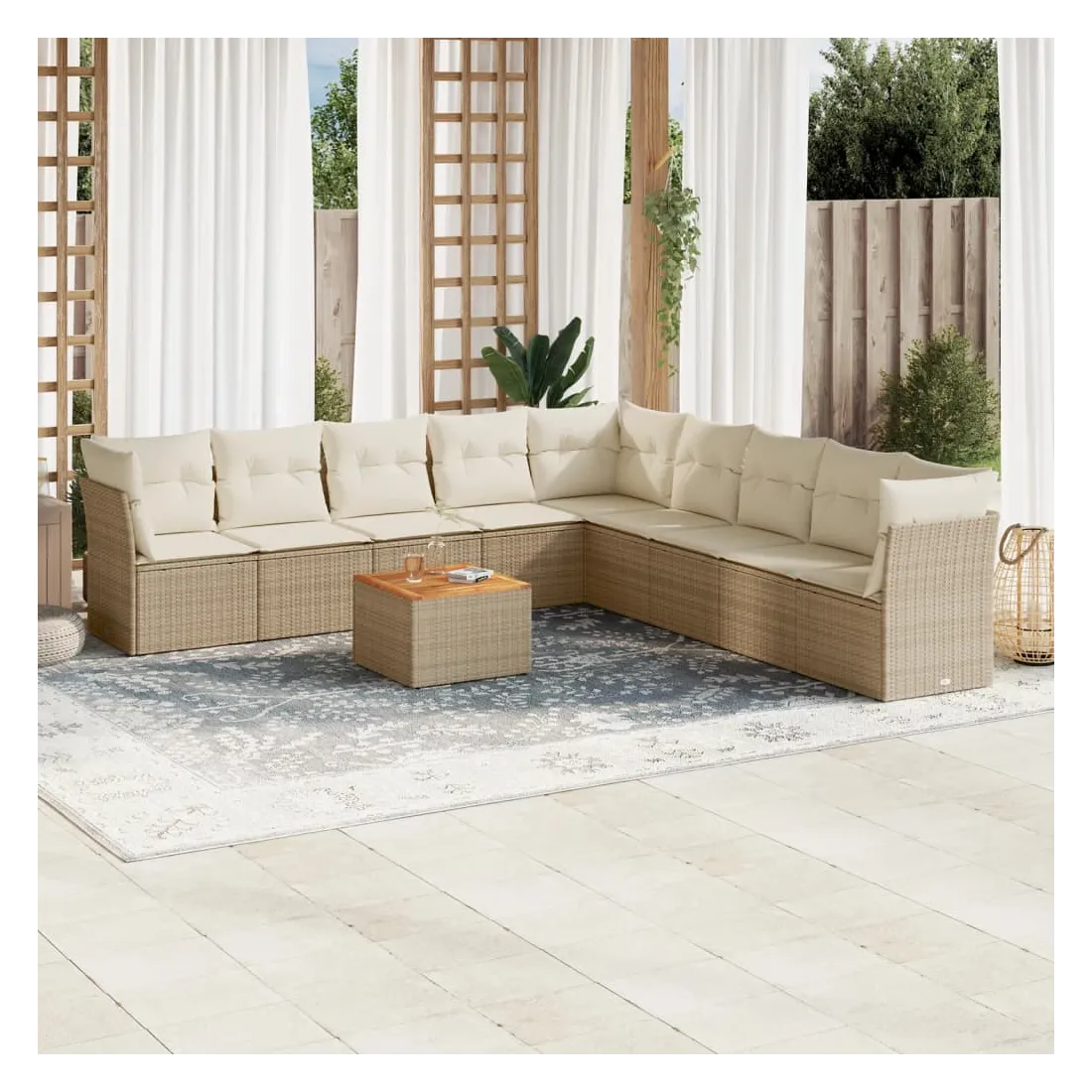 Cet ensemble de canapés de jardin est le complément parfait de votre arrière-cour, terrasse ou patio, offrant un espace confortable et accueillant pour discuter avec la famille et les amis ou simplement se détendre et profiter de l'extérieur. Matériau durable : la résine tressée, également connue sous le nom de poly rotin, est un matériau synthétique solide et nécessitant peu d'entretien qui ressemble au rotin naturel. Il est léger, facile à nettoyer et couramment utilisé pour les meubles d'extérieur en raison de sa durabilité et de ses propriétés de résistance aux intempéries.Fonction de rangement avec sac résistant à l'eau : chaque siège de jardin dispose d'un espace de rangement sous l'assise, complété par un sac résistant à l'eau pour ranger les coussins, les jouets et d'autres objets. Les sacs intérieurs sont dotés d'un couvercle et peuvent être solidement fixés aux sièges à l'aide de bandes auto-agrippantes pour plus de stabilité.Dessus stable et facile à nettoyer : cette table de jardin a un dessus en bois d'acacia robuste, durable et facile à nettoyer avec un chiffon humide.Housse amovible et lavable : ces coussins de siège sont dotés de housses amovibles pour un lavage et un entretien faciles.Conception modulaire : cet ensemble de meubles d'extérieur a une conception modulaire, ce qui le rend complètement flexible et facile à déplacer, afin que vous puissiez créer un agencement de meubles d'extérieur personnalisé. Bon à savoir :Pour que vos meubles d'extérieur restent beaux, nous vous recommandons de les protéger avec une housse imperméable.
