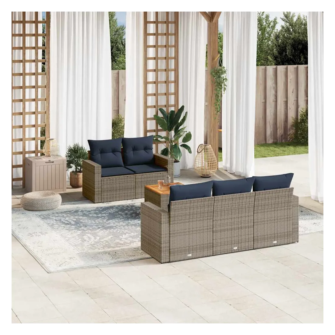 Cet ensemble de canapés de jardin est le complément parfait de votre arrière-cour, terrasse ou patio, offrant un espace confortable et accueillant pour discuter avec la famille et les amis ou simplement se détendre et profiter de l'extérieur. Matériau durable : la résine tressée, également connue sous le nom de poly rotin, est un matériau synthétique solide et nécessitant peu d'entretien qui ressemble au rotin naturel. Il est léger, facile à nettoyer et couramment utilisé pour les meubles d'extérieur en raison de sa durabilité et de ses propriétés de résistance aux intempéries.Fonction de rangement avec sac résistant à l'eau : chaque siège de jardin dispose d'un espace de rangement sous l'assise, complété par un sac résistant à l'eau pour ranger les coussins, les jouets et d'autres objets. Les sacs intérieurs sont dotés d'un couvercle et peuvent être solidement fixés aux sièges à l'aide de bandes auto-agrippantes pour plus de stabilité.Dessus stable et facile à nettoyer : cette table de jardin a un dessus en bois d'acacia robuste, durable et facile à nettoyer avec un chiffon humide.Housse amovible et lavable : ces coussins de siège sont dotés de housses amovibles pour un lavage et un entretien faciles.Conception modulaire : cet ensemble de meubles d'extérieur a une conception modulaire, ce qui le rend complètement flexible et facile à déplacer, afin que vous puissiez créer un agencement de meubles d'extérieur personnalisé. Bon à savoir :Pour que vos meubles d'extérieur restent beaux, nous vous recommandons de les protéger avec une housse imperméable.