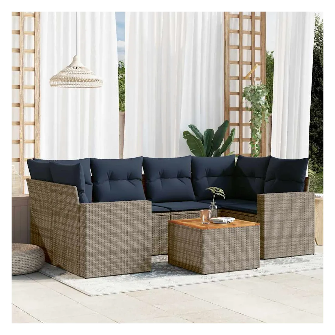 Cet ensemble de canapés de jardin est le complément parfait de votre arrière-cour, terrasse ou patio, offrant un espace confortable et accueillant pour discuter avec la famille et les amis ou simplement se détendre et profiter de l'extérieur. Matériau durable : la résine tressée, également connue sous le nom de poly rotin, est un matériau synthétique solide et nécessitant peu d'entretien qui ressemble au rotin naturel. Il est léger, facile à nettoyer et couramment utilisé pour les meubles d'extérieur en raison de sa durabilité et de ses propriétés de résistance aux intempéries.Fonction de rangement avec sac résistant à l'eau : chaque siège de jardin dispose d'un espace de rangement sous l'assise, complété par un sac résistant à l'eau pour ranger les coussins, les jouets et d'autres objets. Les sacs intérieurs sont dotés d'un couvercle et peuvent être solidement fixés aux sièges à l'aide de bandes auto-agrippantes pour plus de stabilité.Dessus stable et facile à nettoyer : cette table de jardin a un dessus en bois d'acacia robuste, durable et facile à nettoyer avec un chiffon humide.Housse amovible et lavable : ces coussins de siège sont dotés de housses amovibles pour un lavage et un entretien faciles.Conception modulaire : cet ensemble de meubles d'extérieur a une conception modulaire, ce qui le rend complètement flexible et facile à déplacer, afin que vous puissiez créer un agencement de meubles d'extérieur personnalisé. Bon à savoir :Pour que vos meubles d'extérieur restent beaux, nous vous recommandons de les protéger avec une housse imperméable.