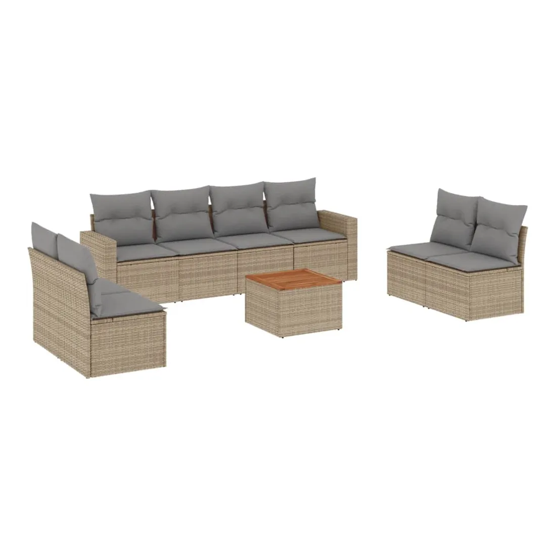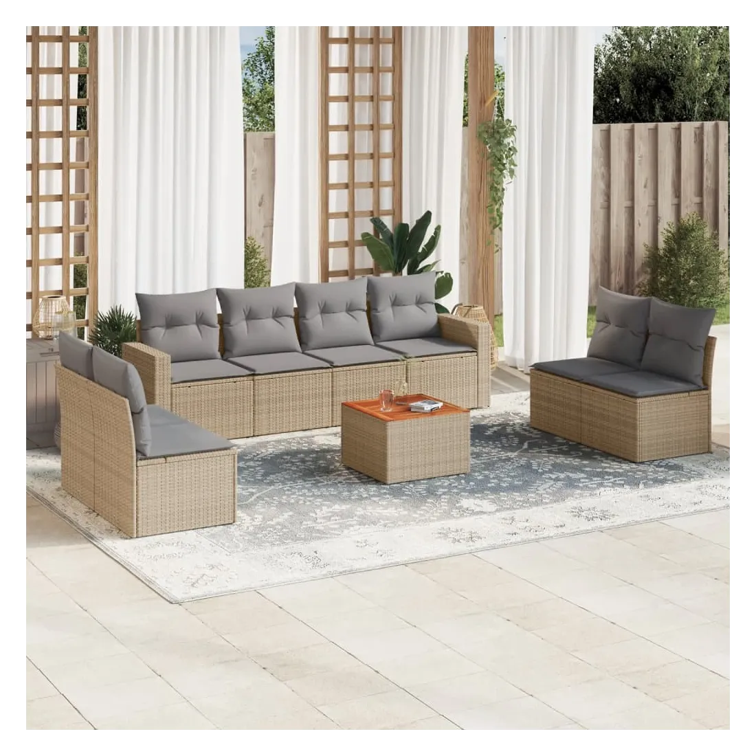 Cet ensemble de canapés de jardin est le complément parfait de votre arrière-cour, terrasse ou patio, offrant un espace confortable et accueillant pour discuter avec la famille et les amis ou simplement se détendre et profiter de l'extérieur. Matériau durable : la résine tressée, également connue sous le nom de poly rotin, est un matériau synthétique solide et nécessitant peu d'entretien qui ressemble au rotin naturel. Il est léger, facile à nettoyer et couramment utilisé pour les meubles d'extérieur en raison de sa durabilité et de ses propriétés de résistance aux intempéries.Fonction de rangement avec sac résistant à l'eau : chaque siège de jardin dispose d'un espace de rangement sous l'assise, complété par un sac résistant à l'eau pour ranger les coussins, les jouets et d'autres objets. Les sacs intérieurs sont dotés d'un couvercle et peuvent être solidement fixés aux sièges à l'aide de bandes auto-agrippantes pour plus de stabilité.Dessus stable et facile à nettoyer : cette table de jardin a un dessus en bois d'acacia robuste, durable et facile à nettoyer avec un chiffon humide.Housse amovible et lavable : ces coussins de siège sont dotés de housses amovibles pour un lavage et un entretien faciles.Conception modulaire : cet ensemble de meubles d'extérieur a une conception modulaire, ce qui le rend complètement flexible et facile à déplacer, afin que vous puissiez créer un agencement de meubles d'extérieur personnalisé. Bon à savoir :Pour que vos meubles d'extérieur restent beaux, nous vous recommandons de les protéger avec une housse imperméable.