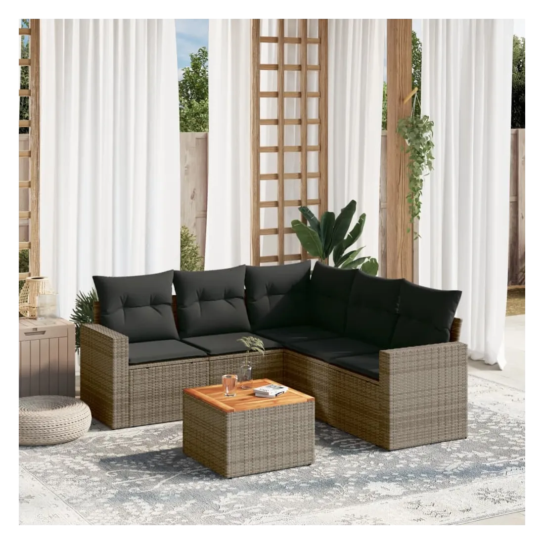 Cet ensemble de canapés de jardin est le complément parfait de votre arrière-cour, terrasse ou patio, offrant un espace confortable et accueillant pour discuter avec la famille et les amis ou simplement se détendre et profiter de l'extérieur. Matériau durable : la résine tressée, également connue sous le nom de poly rotin, est un matériau synthétique solide et nécessitant peu d'entretien qui ressemble au rotin naturel. Il est léger, facile à nettoyer et couramment utilisé pour les meubles d'extérieur en raison de sa durabilité et de ses propriétés de résistance aux intempéries.Fonction de rangement avec sac résistant à l'eau : chaque siège de jardin dispose d'un espace de rangement sous l'assise, complété par un sac résistant à l'eau pour ranger les coussins, les jouets et d'autres objets. Les sacs intérieurs sont dotés d'un couvercle et peuvent être solidement fixés aux sièges à l'aide de bandes auto-agrippantes pour plus de stabilité.Dessus stable et facile à nettoyer : cette table de jardin a un dessus en bois d'acacia robuste, durable et facile à nettoyer avec un chiffon humide.Housse amovible et lavable : ces coussins de siège sont dotés de housses amovibles pour un lavage et un entretien faciles.Conception modulaire : cet ensemble de meubles d'extérieur a une conception modulaire, ce qui le rend complètement flexible et facile à déplacer, afin que vous puissiez créer un agencement de meubles d'extérieur personnalisé. Bon à savoir :Pour que vos meubles d'extérieur restent beaux, nous vous recommandons de les protéger avec une housse imperméable.