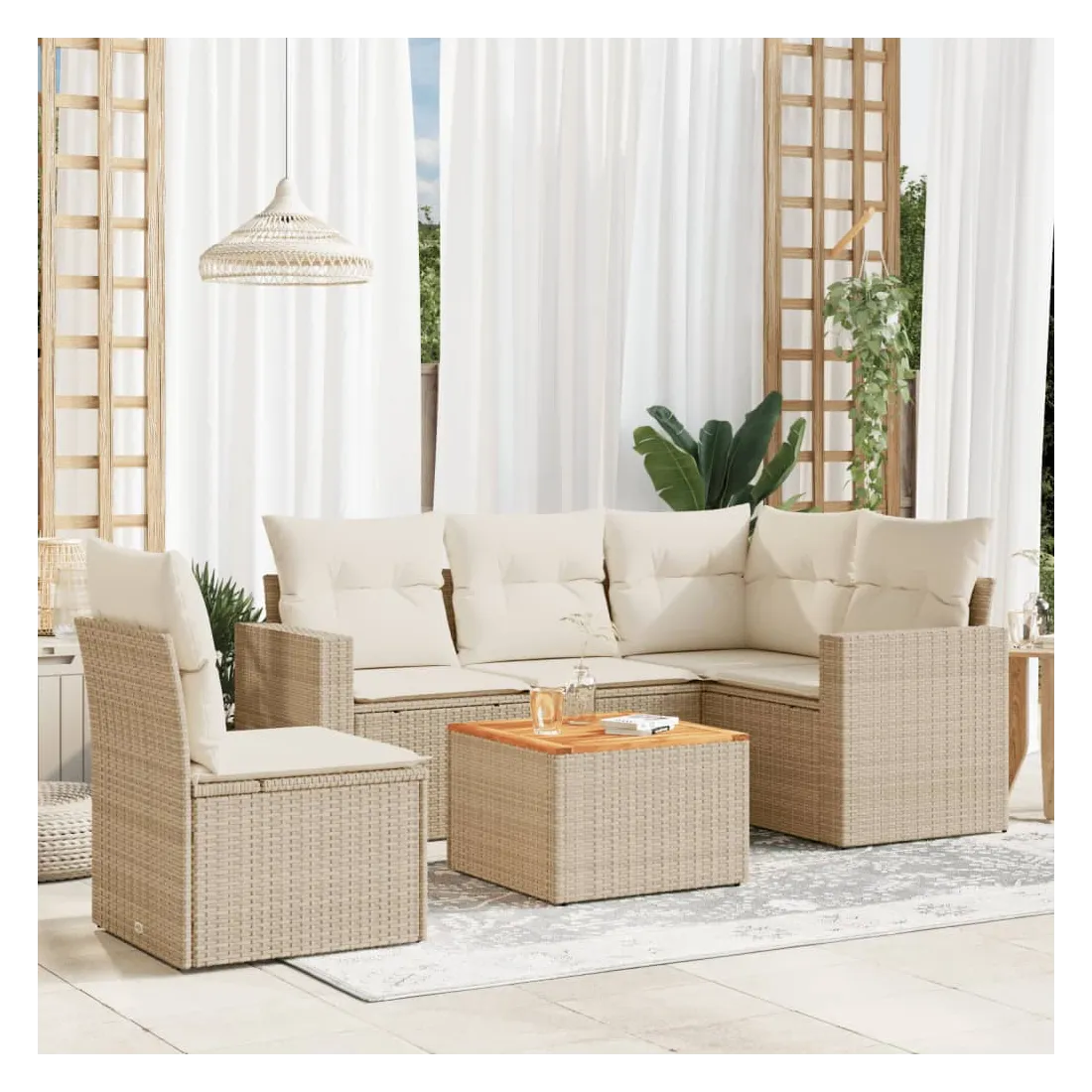 Cet ensemble de canapés de jardin est le complément parfait de votre arrière-cour, terrasse ou patio, offrant un espace confortable et accueillant pour discuter avec la famille et les amis ou simplement se détendre et profiter de l'extérieur. Matériau durable : la résine tressée, également connue sous le nom de poly rotin, est un matériau synthétique solide et nécessitant peu d'entretien qui ressemble au rotin naturel. Il est léger, facile à nettoyer et couramment utilisé pour les meubles d'extérieur en raison de sa durabilité et de ses propriétés de résistance aux intempéries.Fonction de rangement avec sac résistant à l'eau : chaque siège de jardin dispose d'un espace de rangement sous l'assise, complété par un sac résistant à l'eau pour ranger les coussins, les jouets et d'autres objets. Les sacs intérieurs sont dotés d'un couvercle et peuvent être solidement fixés aux sièges à l'aide de bandes auto-agrippantes pour plus de stabilité.Dessus stable et facile à nettoyer : cette table de jardin a un dessus en bois d'acacia robuste, durable et facile à nettoyer avec un chiffon humide.Housse amovible et lavable : ces coussins de siège sont dotés de housses amovibles pour un lavage et un entretien faciles.Conception modulaire : cet ensemble de meubles d'extérieur a une conception modulaire, ce qui le rend complètement flexible et facile à déplacer, afin que vous puissiez créer un agencement de meubles d'extérieur personnalisé. Bon à savoir :Pour que vos meubles d'extérieur restent beaux, nous vous recommandons de les protéger avec une housse imperméable.