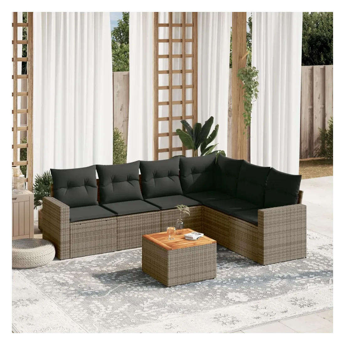 Cet ensemble de canapés de jardin est le complément parfait de votre arrière-cour, terrasse ou patio, offrant un espace confortable et accueillant pour discuter avec la famille et les amis ou simplement se détendre et profiter de l'extérieur. Matériau durable : la résine tressée, également connue sous le nom de poly rotin, est un matériau synthétique solide et nécessitant peu d'entretien qui ressemble au rotin naturel. Il est léger, facile à nettoyer et couramment utilisé pour les meubles d'extérieur en raison de sa durabilité et de ses propriétés de résistance aux intempéries.Fonction de rangement avec sac résistant à l'eau : chaque siège de jardin dispose d'un espace de rangement sous l'assise, complété par un sac résistant à l'eau pour ranger les coussins, les jouets et d'autres objets. Les sacs intérieurs sont dotés d'un couvercle et peuvent être solidement fixés aux sièges à l'aide de bandes auto-agrippantes pour plus de stabilité.Dessus stable et facile à nettoyer : cette table de jardin a un dessus en bois d'acacia robuste, durable et facile à nettoyer avec un chiffon humide.Housse amovible et lavable : ces coussins de siège sont dotés de housses amovibles pour un lavage et un entretien faciles.Conception modulaire : cet ensemble de meubles d'extérieur a une conception modulaire, ce qui le rend complètement flexible et facile à déplacer, afin que vous puissiez créer un agencement de meubles d'extérieur personnalisé. Bon à savoir :Pour que vos meubles d'extérieur restent beaux, nous vous recommandons de les protéger avec une housse imperméable.