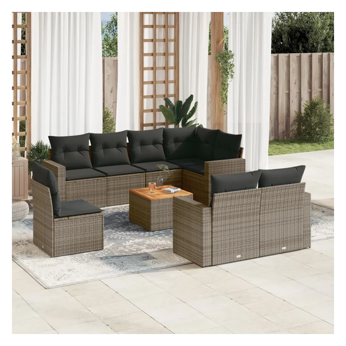 Cet ensemble de canapés de jardin est le complément parfait de votre arrière-cour, terrasse ou patio, offrant un espace confortable et accueillant pour discuter avec la famille et les amis ou simplement se détendre et profiter de l'extérieur. Matériau durable : la résine tressée, également connue sous le nom de poly rotin, est un matériau synthétique solide et nécessitant peu d'entretien qui ressemble au rotin naturel. Il est léger, facile à nettoyer et couramment utilisé pour les meubles d'extérieur en raison de sa durabilité et de ses propriétés de résistance aux intempéries.Fonction de rangement avec sac résistant à l'eau : chaque siège de jardin dispose d'un espace de rangement sous l'assise, complété par un sac résistant à l'eau pour ranger les coussins, les jouets et d'autres objets. Les sacs intérieurs sont dotés d'un couvercle et peuvent être solidement fixés aux sièges à l'aide de bandes auto-agrippantes pour plus de stabilité.Dessus stable et facile à nettoyer : cette table de jardin a un dessus en bois d'acacia robuste, durable et facile à nettoyer avec un chiffon humide.Housse amovible et lavable : ces coussins de siège sont dotés de housses amovibles pour un lavage et un entretien faciles.Conception modulaire : cet ensemble de meubles d'extérieur a une conception modulaire, ce qui le rend complètement flexible et facile à déplacer, afin que vous puissiez créer un agencement de meubles d'extérieur personnalisé. Bon à savoir :Pour que vos meubles d'extérieur restent beaux, nous vous recommandons de les protéger avec une housse imperméable.