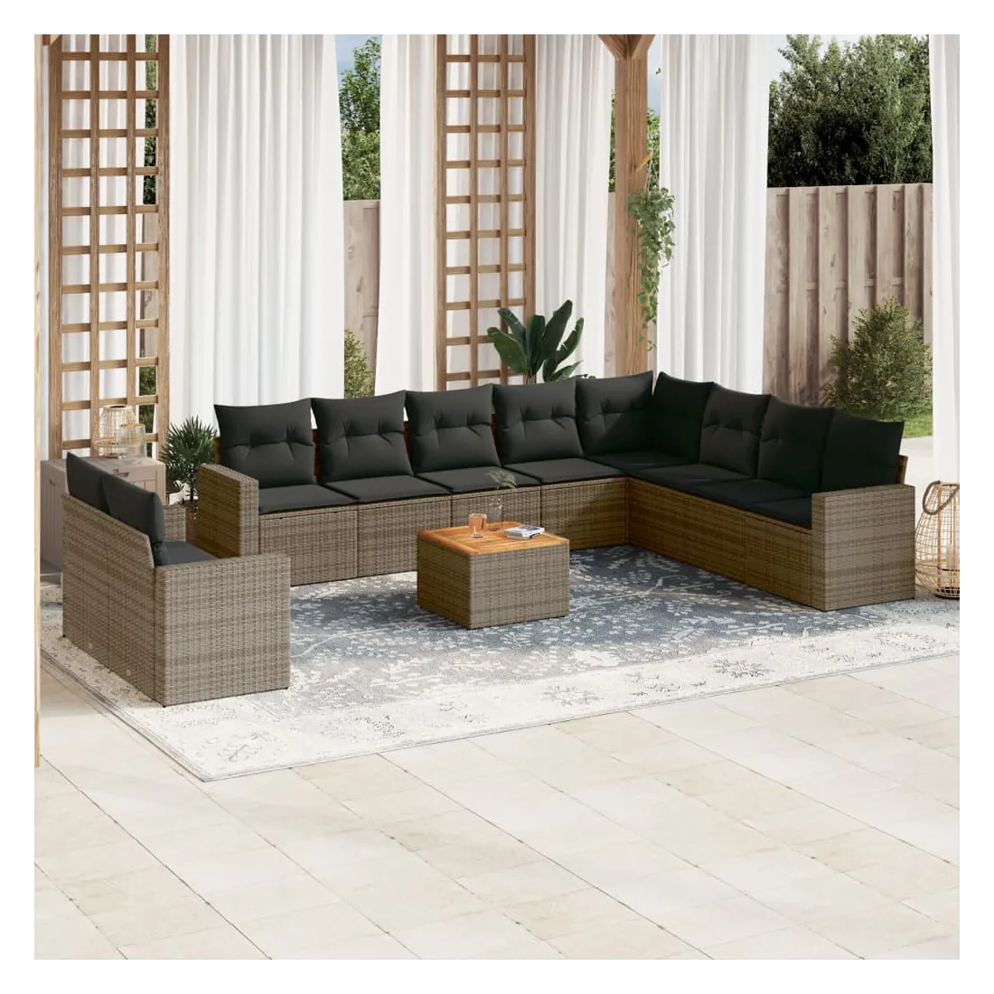 Cet ensemble de canapés de jardin est le complément parfait de votre arrière-cour, terrasse ou patio, offrant un espace confortable et accueillant pour discuter avec la famille et les amis ou simplement se détendre et profiter de l'extérieur. Matériau durable : la résine tressée, également connue sous le nom de poly rotin, est un matériau synthétique solide et nécessitant peu d'entretien qui ressemble au rotin naturel. Il est léger, facile à nettoyer et couramment utilisé pour les meubles d'extérieur en raison de sa durabilité et de ses propriétés de résistance aux intempéries.Fonction de rangement avec sac résistant à l'eau : chaque siège de jardin dispose d'un espace de rangement sous l'assise, complété par un sac résistant à l'eau pour ranger les coussins, les jouets et d'autres objets. Les sacs intérieurs sont dotés d'un couvercle et peuvent être solidement fixés aux sièges à l'aide de bandes auto-agrippantes pour plus de stabilité.Dessus stable et facile à nettoyer : cette table de jardin a un dessus en bois d'acacia robuste, durable et facile à nettoyer avec un chiffon humide.Housse amovible et lavable : ces coussins de siège sont dotés de housses amovibles pour un lavage et un entretien faciles.Conception modulaire : cet ensemble de meubles d'extérieur a une conception modulaire, ce qui le rend complètement flexible et facile à déplacer, afin que vous puissiez créer un agencement de meubles d'extérieur personnalisé. Bon à savoir :Pour que vos meubles d'extérieur restent beaux, nous vous recommandons de les protéger avec une housse imperméable.