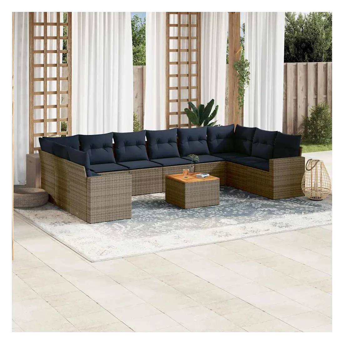 Cet ensemble de canapés de jardin est le complément parfait de votre arrière-cour, terrasse ou patio, offrant un espace confortable et accueillant pour discuter avec la famille et les amis ou simplement se détendre et profiter de l'extérieur. Matériau durable : la résine tressée, également connue sous le nom de poly rotin, est un matériau synthétique solide et nécessitant peu d'entretien qui ressemble au rotin naturel. Il est léger, facile à nettoyer et couramment utilisé pour les meubles d'extérieur en raison de sa durabilité et de ses propriétés de résistance aux intempéries.Fonction de rangement avec sac résistant à l'eau : chaque siège de jardin dispose d'un espace de rangement sous l'assise, complété par un sac résistant à l'eau pour ranger les coussins, les jouets et d'autres objets. Les sacs intérieurs sont dotés d'un couvercle et peuvent être solidement fixés aux sièges à l'aide de bandes auto-agrippantes pour plus de stabilité.Dessus stable et facile à nettoyer : cette table de jardin a un dessus en bois d'acacia robuste, durable et facile à nettoyer avec un chiffon humide.Housse amovible et lavable : ces coussins de siège sont dotés de housses amovibles pour un lavage et un entretien faciles.Conception modulaire : cet ensemble de meubles d'extérieur a une conception modulaire, ce qui le rend complètement flexible et facile à déplacer, afin que vous puissiez créer un agencement de meubles d'extérieur personnalisé. Bon à savoir :Pour que vos meubles d'extérieur restent beaux, nous vous recommandons de les protéger avec une housse imperméable.