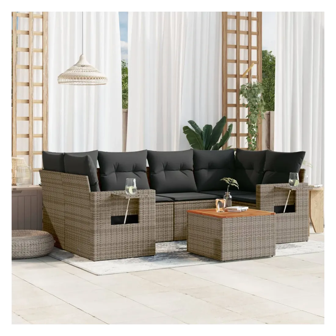 Cet ensemble de canapés de jardin est le complément parfait de votre arrière-cour, terrasse ou patio, offrant un espace confortable et accueillant pour discuter avec la famille et les amis ou simplement se détendre et profiter de l'extérieur. Matériau durable : la résine tressée, également connue sous le nom de poly rotin, est un matériau synthétique solide et nécessitant peu d'entretien qui ressemble au rotin naturel. Il est léger, facile à nettoyer et couramment utilisé pour les meubles d'extérieur en raison de sa durabilité et de ses propriétés de résistance aux intempéries.Fonction de rangement avec sac résistant à l'eau : chaque siège de jardin dispose d'un espace de rangement sous l'assise, complété par un sac résistant à l'eau pour ranger les coussins, les jouets et d'autres objets. Les sacs intérieurs sont dotés d'un couvercle et peuvent être solidement fixés aux sièges à l'aide de bandes auto-agrippantes pour plus de stabilité.Dessus stable et facile à nettoyer : cette table de jardin a un dessus en bois d'acacia robuste, durable et facile à nettoyer avec un chiffon humide.Table d'appoint pratique : ce mobilier d'extérieur comprend des tables d'appoint pliables avec un ressort à gaz sur les accoudoirs, offrant des endroits pratiques pour garder vos essentiels à portée de main.Conception modulaire : cet ensemble de meubles d'extérieur a une conception modulaire, ce qui le rend complètement flexible et facile à déplacer, afin que vous puissiez créer un agencement de meubles d'extérieur personnalisé. Bon à savoir :Pour que vos meubles d'extérieur restent beaux, nous vous recommandons de les protéger avec une housse imperméable.