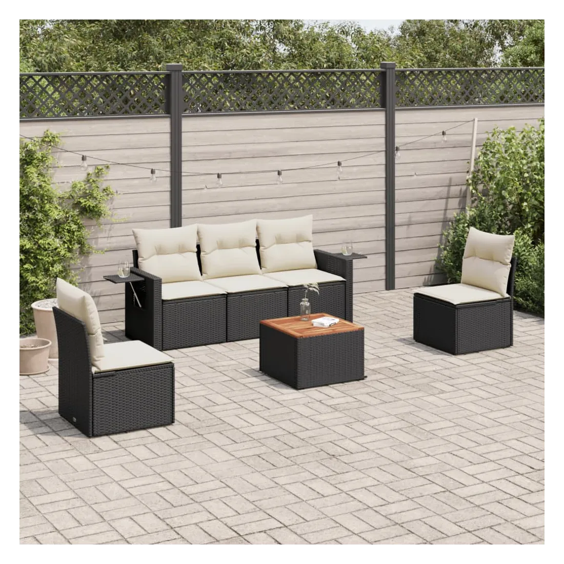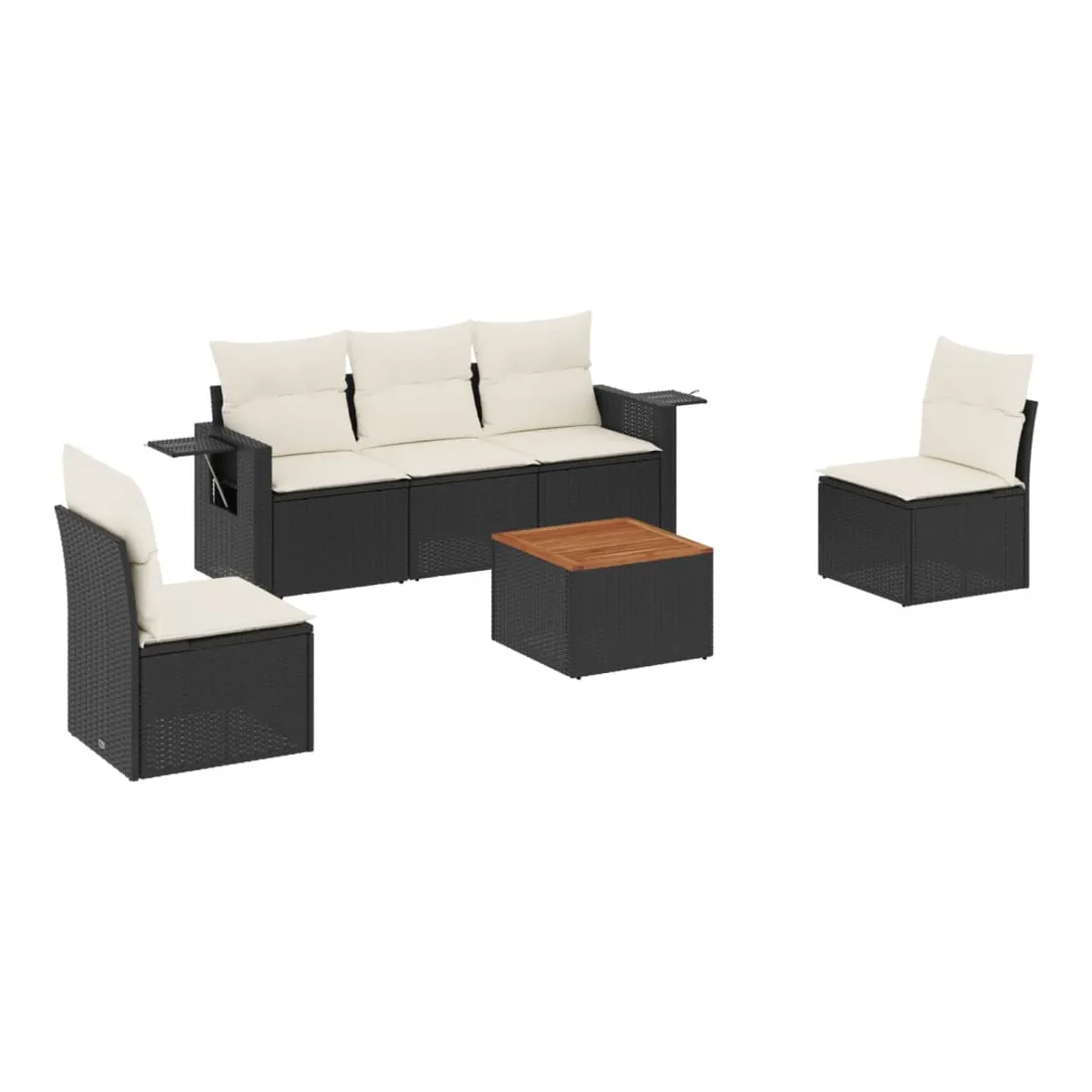 Cet ensemble de canapés de jardin est le complément parfait de votre arrière-cour, terrasse ou patio, offrant un espace confortable et accueillant pour discuter avec la famille et les amis ou simplement se détendre et profiter de l'extérieur. Matériau durable : la résine tressée, également connue sous le nom de poly rotin, est un matériau synthétique solide et nécessitant peu d'entretien qui ressemble au rotin naturel. Il est léger, facile à nettoyer et couramment utilisé pour les meubles d'extérieur en raison de sa durabilité et de ses propriétés de résistance aux intempéries.Fonction de rangement avec sac résistant à l'eau : chaque siège de jardin dispose d'un espace de rangement sous l'assise, complété par un sac résistant à l'eau pour ranger les coussins, les jouets et d'autres objets. Les sacs intérieurs sont dotés d'un couvercle et peuvent être solidement fixés aux sièges à l'aide de bandes auto-agrippantes pour plus de stabilité.Dessus stable et facile à nettoyer : cette table de jardin a un dessus en bois d'acacia robuste, durable et facile à nettoyer avec un chiffon humide.Table d'appoint pratique : ce mobilier d'extérieur comprend des tables d'appoint pliables avec un ressort à gaz sur les accoudoirs, offrant des endroits pratiques pour garder vos essentiels à portée de main.Conception modulaire : cet ensemble de meubles d'extérieur a une conception modulaire, ce qui le rend complètement flexible et facile à déplacer, afin que vous puissiez créer un agencement de meubles d'extérieur personnalisé. Bon à savoir :Pour que vos meubles d'extérieur restent beaux, nous vous recommandons de les protéger avec une housse imperméable.