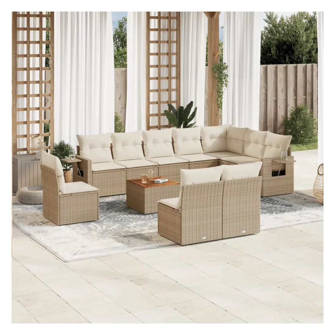 Cet ensemble de canapés de jardin est le complément parfait de votre arrière-cour, terrasse ou patio, offrant un espace confortable et accueillant pour discuter avec la famille et les amis ou simplement se détendre et profiter de l'extérieur. Matériau durable : la résine tressée, également connue sous le nom de poly rotin, est un matériau synthétique solide et nécessitant peu d'entretien qui ressemble au rotin naturel. Il est léger, facile à nettoyer et couramment utilisé pour les meubles d'extérieur en raison de sa durabilité et de ses propriétés de résistance aux intempéries.Fonction de rangement avec sac résistant à l'eau : chaque siège de jardin dispose d'un espace de rangement sous l'assise, complété par un sac résistant à l'eau pour ranger les coussins, les jouets et d'autres objets. Les sacs intérieurs sont dotés d'un couvercle et peuvent être solidement fixés aux sièges à l'aide de bandes auto-agrippantes pour plus de stabilité.Dessus stable et facile à nettoyer : cette table de jardin a un dessus en bois d'acacia robuste, durable et facile à nettoyer avec un chiffon humide.Table d'appoint pratique : ce mobilier d'extérieur comprend des tables d'appoint pliables avec un ressort à gaz sur les accoudoirs, offrant des endroits pratiques pour garder vos essentiels à portée de main.Conception modulaire : cet ensemble de meubles d'extérieur a une conception modulaire, ce qui le rend complètement flexible et facile à déplacer, afin que vous puissiez créer un agencement de meubles d'extérieur personnalisé. Bon à savoir :Pour que vos meubles d'extérieur restent beaux, nous vous recommandons de les protéger avec une housse imperméable.