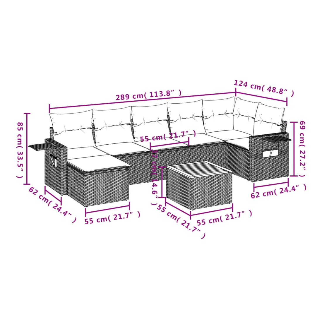 Cet ensemble de canapés de jardin est le complément parfait de votre arrière-cour, terrasse ou patio, offrant un espace confortable et accueillant pour discuter avec la famille et les amis ou simplement se détendre et profiter de l'extérieur. Matériau durable : la résine tressée, également connue sous le nom de poly rotin, est un matériau synthétique solide et nécessitant peu d'entretien qui ressemble au rotin naturel. Il est léger, facile à nettoyer et couramment utilisé pour les meubles d'extérieur en raison de sa durabilité et de ses propriétés de résistance aux intempéries.Fonction de rangement avec sac résistant à l'eau : chaque siège de jardin dispose d'un espace de rangement sous l'assise, complété par un sac résistant à l'eau pour ranger les coussins, les jouets et d'autres objets. Les sacs intérieurs sont dotés d'un couvercle et peuvent être solidement fixés aux sièges à l'aide de bandes auto-agrippantes pour plus de stabilité.Dessus stable et facile à nettoyer : cette table de jardin a un dessus en bois d'acacia robuste, durable et facile à nettoyer avec un chiffon humide.Table d'appoint pratique : ce mobilier d'extérieur comprend des tables d'appoint pliables avec un ressort à gaz sur les accoudoirs, offrant des endroits pratiques pour garder vos essentiels à portée de main.Conception modulaire : cet ensemble de meubles d'extérieur a une conception modulaire, ce qui le rend complètement flexible et facile à déplacer, afin que vous puissiez créer un agencement de meubles d'extérieur personnalisé. Bon à savoir :Pour que vos meubles d'extérieur restent beaux, nous vous recommandons de les protéger avec une housse imperméable.