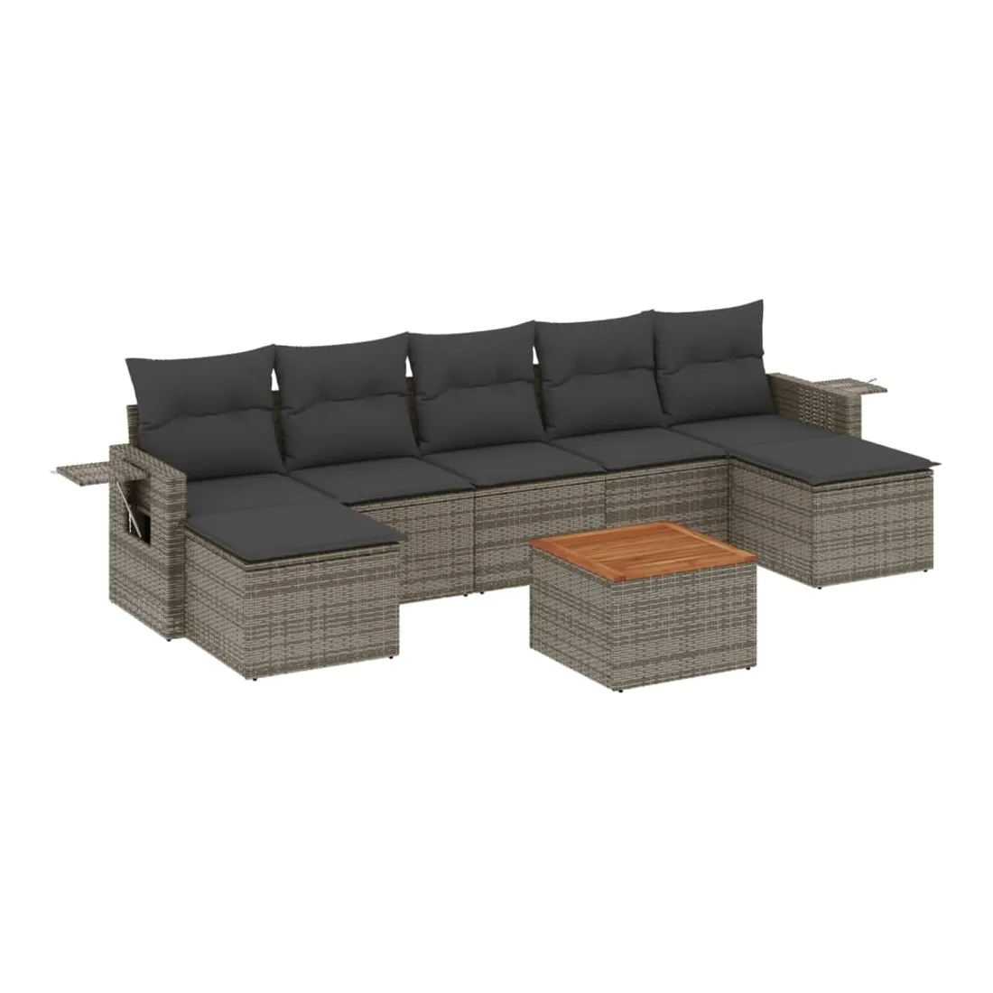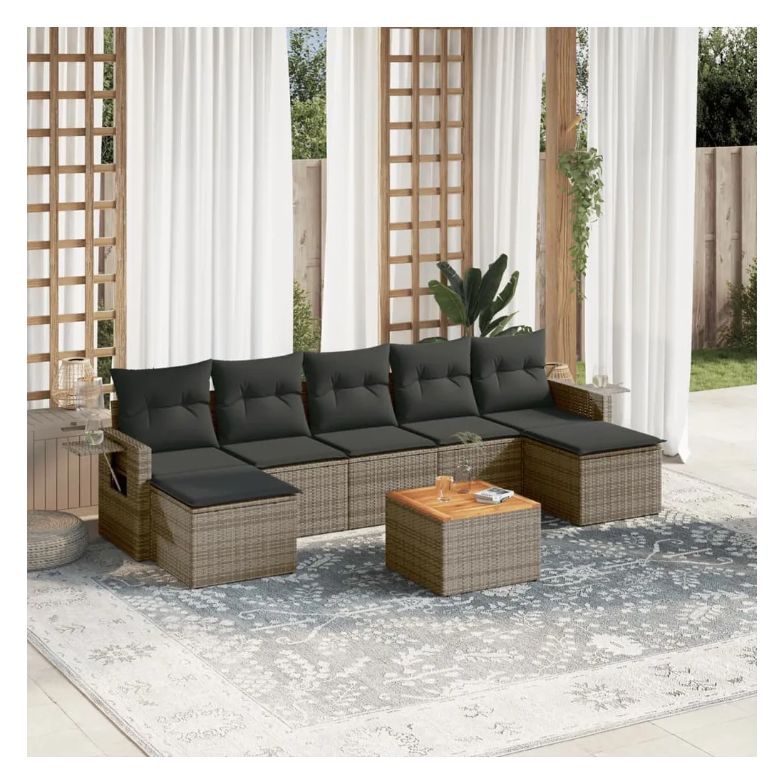 Cet ensemble de canapés de jardin est le complément parfait de votre arrière-cour, terrasse ou patio, offrant un espace confortable et accueillant pour discuter avec la famille et les amis ou simplement se détendre et profiter de l'extérieur. Matériau durable : la résine tressée, également connue sous le nom de poly rotin, est un matériau synthétique solide et nécessitant peu d'entretien qui ressemble au rotin naturel. Il est léger, facile à nettoyer et couramment utilisé pour les meubles d'extérieur en raison de sa durabilité et de ses propriétés de résistance aux intempéries.Fonction de rangement avec sac résistant à l'eau : chaque siège de jardin dispose d'un espace de rangement sous l'assise, complété par un sac résistant à l'eau pour ranger les coussins, les jouets et d'autres objets. Les sacs intérieurs sont dotés d'un couvercle et peuvent être solidement fixés aux sièges à l'aide de bandes auto-agrippantes pour plus de stabilité.Dessus stable et facile à nettoyer : cette table de jardin a un dessus en bois d'acacia robuste, durable et facile à nettoyer avec un chiffon humide.Table d'appoint pratique : ce mobilier d'extérieur comprend des tables d'appoint pliables avec un ressort à gaz sur les accoudoirs, offrant des endroits pratiques pour garder vos essentiels à portée de main.Conception modulaire : cet ensemble de meubles d'extérieur a une conception modulaire, ce qui le rend complètement flexible et facile à déplacer, afin que vous puissiez créer un agencement de meubles d'extérieur personnalisé. Bon à savoir :Pour que vos meubles d'extérieur restent beaux, nous vous recommandons de les protéger avec une housse imperméable.