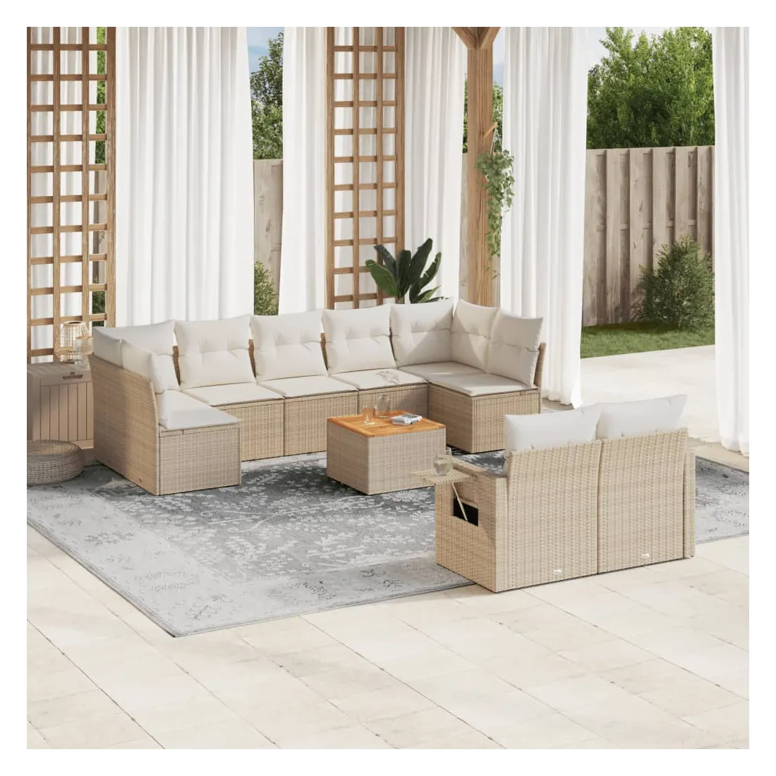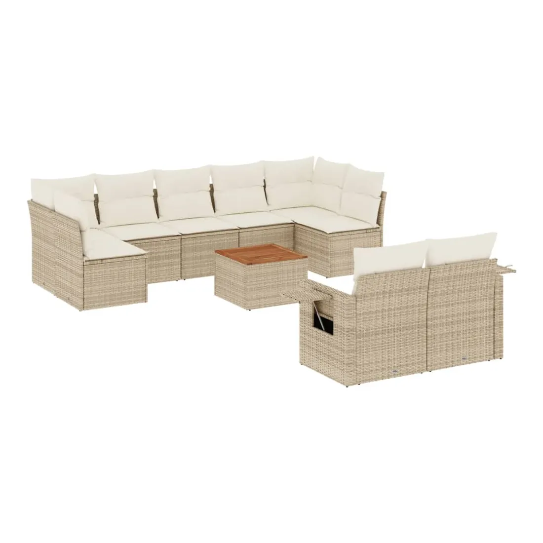 Cet ensemble de canapés de jardin est le complément parfait de votre arrière-cour, terrasse ou patio, offrant un espace confortable et accueillant pour discuter avec la famille et les amis ou simplement se détendre et profiter de l'extérieur. Matériau durable : la résine tressée, également connue sous le nom de poly rotin, est un matériau synthétique solide et nécessitant peu d'entretien qui ressemble au rotin naturel. Il est léger, facile à nettoyer et couramment utilisé pour les meubles d'extérieur en raison de sa durabilité et de ses propriétés de résistance aux intempéries.Fonction de rangement avec sac résistant à l'eau : chaque siège de jardin dispose d'un espace de rangement sous l'assise, complété par un sac résistant à l'eau pour ranger les coussins, les jouets et d'autres objets. Les sacs intérieurs sont dotés d'un couvercle et peuvent être solidement fixés aux sièges à l'aide de bandes auto-agrippantes pour plus de stabilité.Dessus stable et facile à nettoyer : cette table de jardin a un dessus en bois d'acacia robuste, durable et facile à nettoyer avec un chiffon humide.Table d'appoint pratique : ce mobilier d'extérieur comprend des tables d'appoint pliables avec un ressort à gaz sur les accoudoirs, offrant des endroits pratiques pour garder vos essentiels à portée de main.Conception modulaire : cet ensemble de meubles d'extérieur a une conception modulaire, ce qui le rend complètement flexible et facile à déplacer, afin que vous puissiez créer un agencement de meubles d'extérieur personnalisé. Bon à savoir :Pour que vos meubles d'extérieur restent beaux, nous vous recommandons de les protéger avec une housse imperméable.