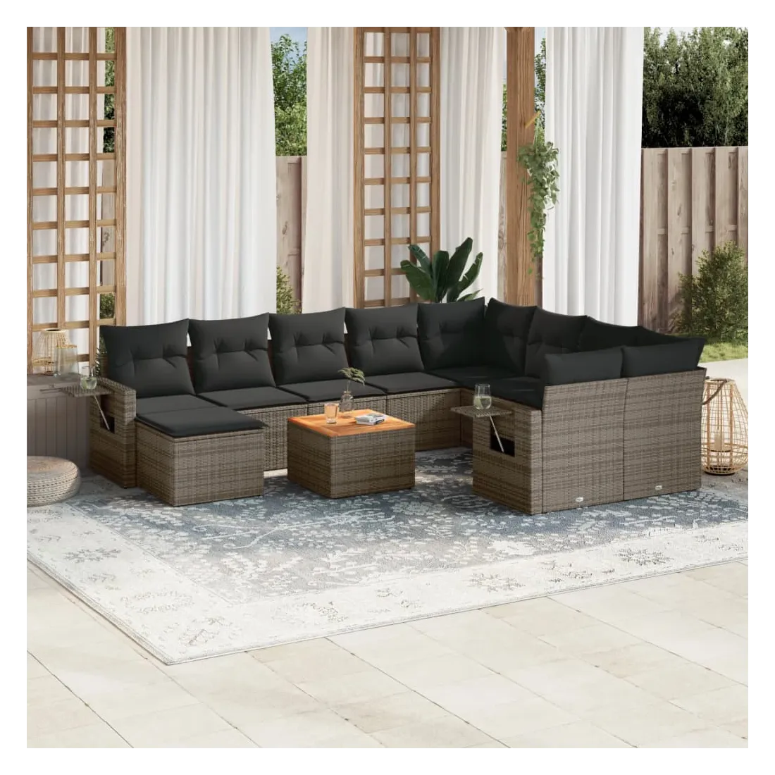 Cet ensemble de canapés de jardin est le complément parfait de votre arrière-cour, terrasse ou patio, offrant un espace confortable et accueillant pour discuter avec la famille et les amis ou simplement se détendre et profiter de l'extérieur. Matériau durable : la résine tressée, également connue sous le nom de poly rotin, est un matériau synthétique solide et nécessitant peu d'entretien qui ressemble au rotin naturel. Il est léger, facile à nettoyer et couramment utilisé pour les meubles d'extérieur en raison de sa durabilité et de ses propriétés de résistance aux intempéries.Fonction de rangement avec sac résistant à l'eau : chaque siège de jardin dispose d'un espace de rangement sous l'assise, complété par un sac résistant à l'eau pour ranger les coussins, les jouets et d'autres objets. Les sacs intérieurs sont dotés d'un couvercle et peuvent être solidement fixés aux sièges à l'aide de bandes auto-agrippantes pour plus de stabilité.Dessus stable et facile à nettoyer : cette table de jardin a un dessus en bois d'acacia robuste, durable et facile à nettoyer avec un chiffon humide.Table d'appoint pratique : ce mobilier d'extérieur comprend des tables d'appoint pliables avec un ressort à gaz sur les accoudoirs, offrant des endroits pratiques pour garder vos essentiels à portée de main.Conception modulaire : cet ensemble de meubles d'extérieur a une conception modulaire, ce qui le rend complètement flexible et facile à déplacer, afin que vous puissiez créer un agencement de meubles d'extérieur personnalisé. Bon à savoir :Pour que vos meubles d'extérieur restent beaux, nous vous recommandons de les protéger avec une housse imperméable.