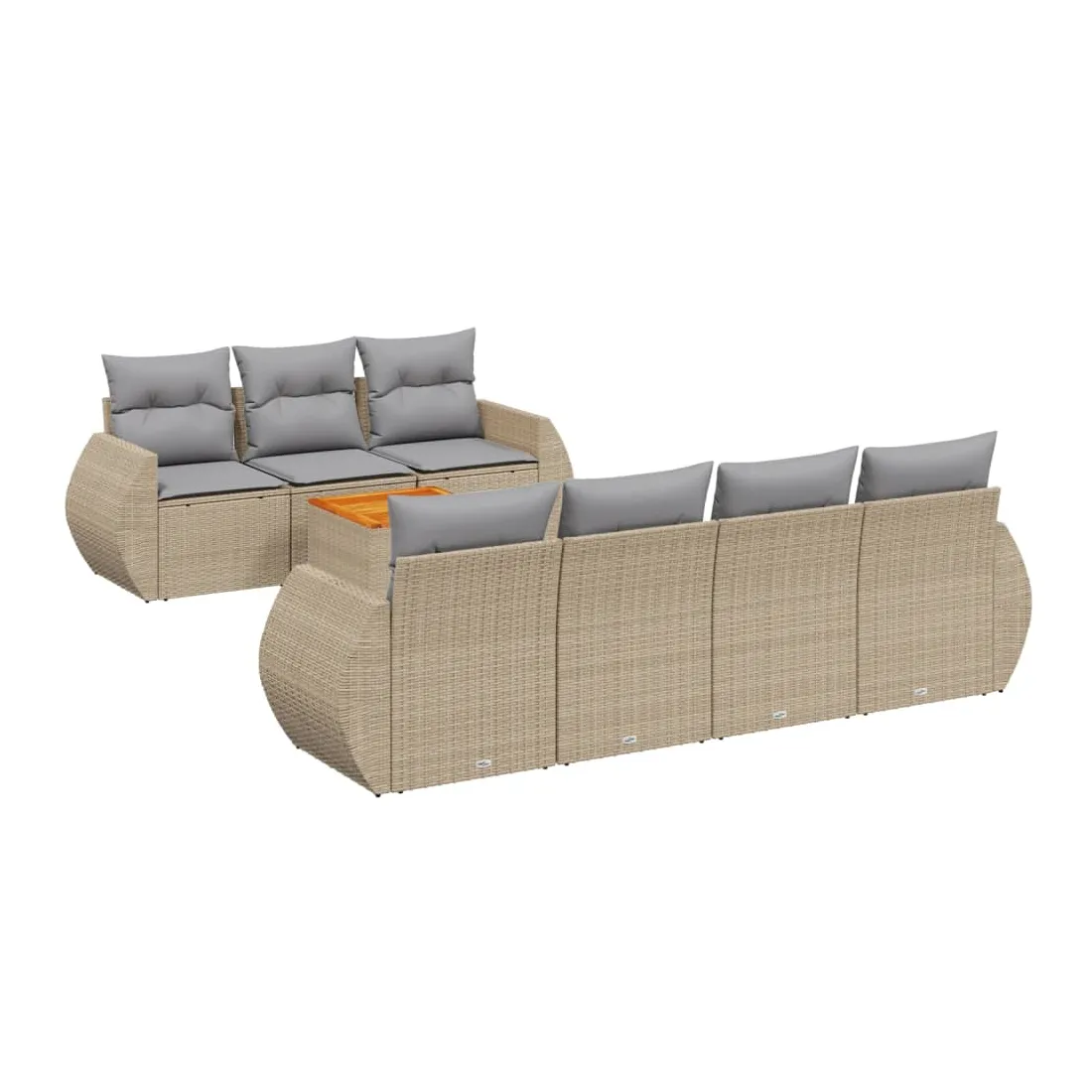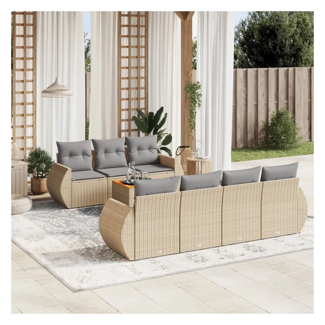Cet ensemble de canapés de jardin est le complément parfait de votre arrière-cour, terrasse ou patio, offrant un espace confortable et accueillant pour discuter avec la famille et les amis ou simplement se détendre et profiter de l'extérieur. Matériau durable : la résine tressée, également connue sous le nom de poly rotin, est un matériau synthétique solide et nécessitant peu d'entretien qui ressemble au rotin naturel. Il est léger, facile à nettoyer et couramment utilisé pour les meubles d'extérieur en raison de sa durabilité et de ses propriétés de résistance aux intempéries.Dessus stable et facile à nettoyer : cette table de jardin a un dessus en bois d'acacia robuste, durable et facile à nettoyer avec un chiffon humide. Fonction de rangement avec sac résistant à l'eau : chaque siège de jardin dispose d'un espace de rangement sous l'assise, complété par un sac résistant à l'eau pour ranger les coussins, les jouets et d'autres objets. Les sacs intérieurs sont dotés d'un couvercle et peuvent être solidement fixés aux sièges à l'aide de bandes auto-agrippantes pour plus de stabilité.Expérience d'assise confortable : ce mobilier d'extérieur, doté de coussins épais, offre une expérience d'assise confortable.Conception modulaire : cet ensemble de meubles d'extérieur a une conception modulaire, ce qui le rend complètement flexible et facile à déplacer, afin que vous puissiez créer un agencement de meubles d'extérieur personnalisé. Bon à savoir :Pour que vos meubles d'extérieur restent beaux, nous vous recommandons de les protéger avec une housse imperméable.